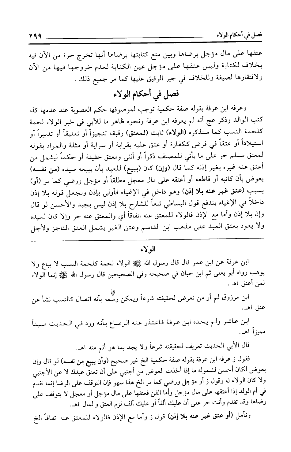 ابن عرفة عن ابن عمر قال قال رسول الله - صلى الله عليه وسلم - الولاء لحمة كلحمة النسب لا يباع ولا يوهب رواه أبو يعلى ثم ابن حبان في صحيحه وفي الصحيحين قال رسول الله - صلى الله عليه وسلم - إنما الولاء لمن أعتق اهـ.