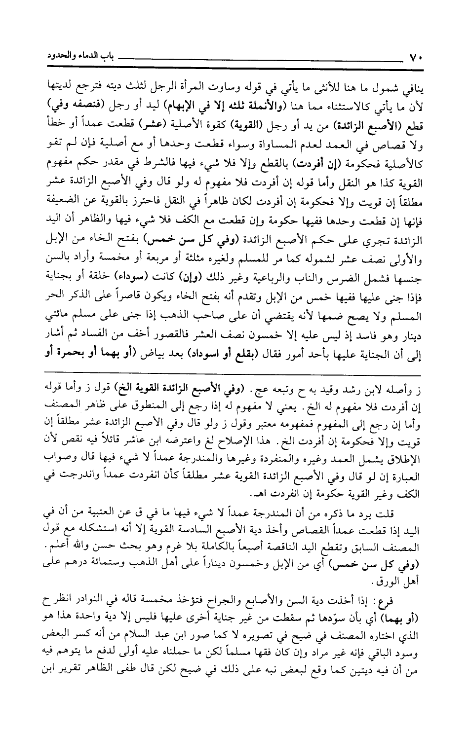 ز وأصله لابن رشد وقيد به ح وتبعه عج. (وفي الأصبع الزائدة القوية الخ) قول ز وأما قوله إن أفردت فلا مفهوم له الخ. يعني لا مفهوم له إذا رجع إلى المنطوق على ظاهر المصنف وأما إن رجع إلى المفهوم فمفهومه معتبر وقول ز ولو قال وفي الأصبع الزائدة عشر مطلقًا إن قويت وإلا فحكومة إن أفردت الخ. هذا الإصلاح لغ واعترضه ابن عاشر قائلًا فيه نقص لأن الإطلاق يشمل العمد وغيره والمنفردة وغيرها والمندرجة عمدًا لا شيء فيها قال وصواب العبارة إن لو قال وفي الأصبع الزائدة القوية عشر مطلقًا كأن انفردت عمدًا واندرجت في الكف وغير القوية حكومة إن انفردت اهـ.