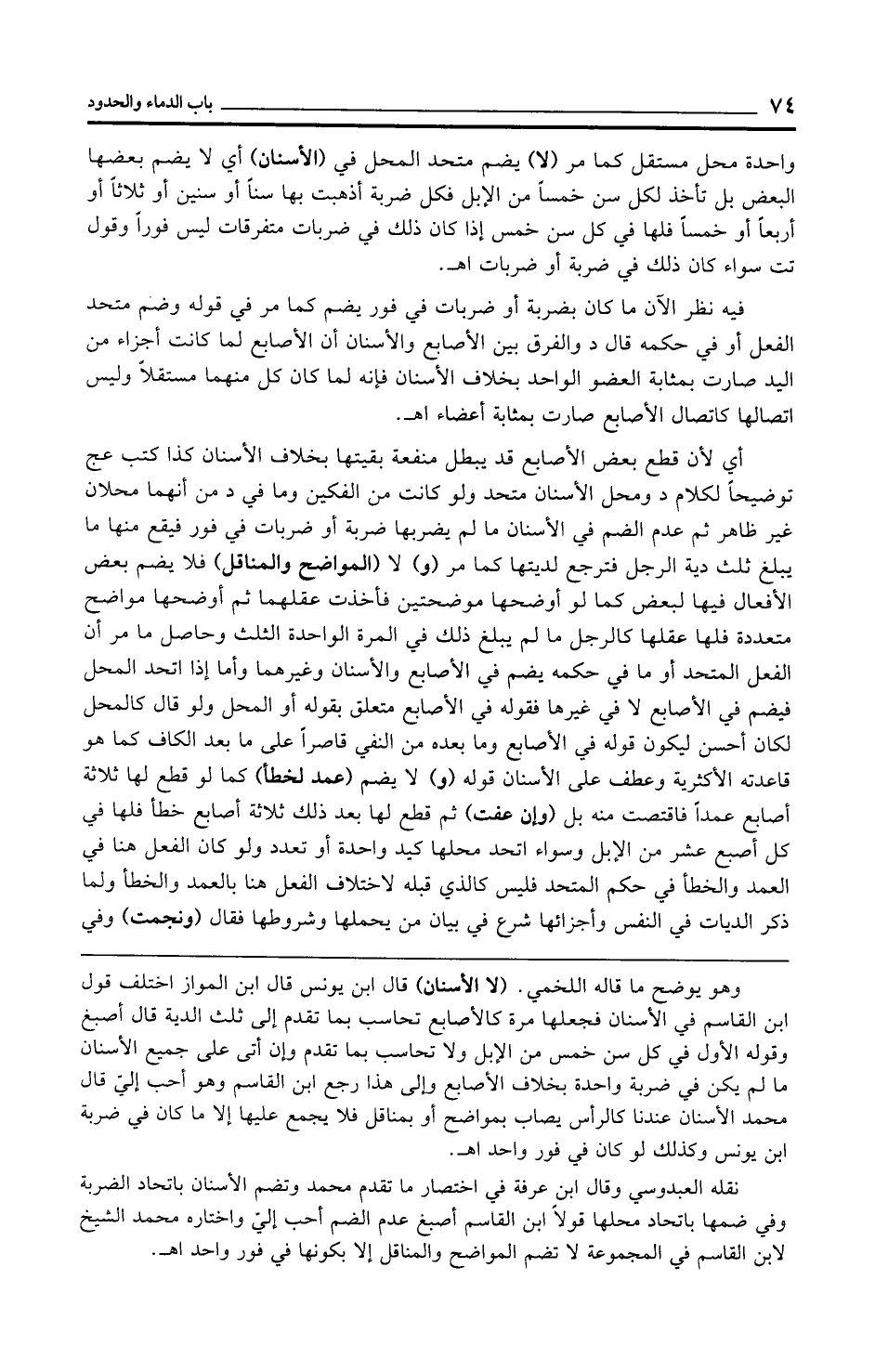 نقله العبدوسي وقال ابن عرفة في اختصار ما تقدم محمَّد وتضم الأسنان باتحاد الضربة وفي ضمها باتحاد محلها قولا ابن القاسم أصبغ عدم الضم أحب إليّ واختاره محمَّد الشيخ لابن القاسم في المجموعة لا تضم المواضع والمناقل إلا بكونها في فور واحد اهـ.