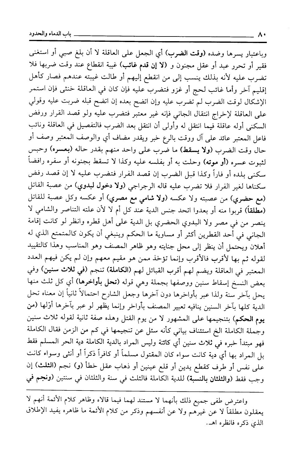 وباعتيار يسرها وضده (وقت الضرب) أي الجعل على العاقلة لا أن بلغ صبي أو استغنى فقير أو تحرر عبد أو عقل مجنون و (لا إن قدم غائب) غيبة انقطاع عند وقت ضربها فلا تضرب عليه لأنه بذلك ينسب إلى من انقطع إليهم أو طالت غيبته عندهم فصار كأهل إقليم آخر وأما غائب لحج أو غزو فتضرب عليه فإن كان في العاقلة خنثى فإن استمر الإشكال لوقت الضرب لم تضرب عليه وإن اتضح بعده إن اتضح قبله ضربت عليه وقولي على العاقلة لإخراج انتقال الجاني فإنه غير معتبر فتضرب عليه ولو قصد القرار ورفض السكنى أوله عاقلة فيما انتقل له وأولى أن انتقل بعد الضرب فالتفصيل في العاقلة ونائب فاعل المعتبر عائد على آل ووقت بالرع خبر ويقدر مضاف أي والوصف المعتبر وصف أو حال وقت الضرب (ولا يسقط) ما ضرب على واحد منهم بقدر حاله (بعسره) وحبس لثبوت عسره (أو موته) وحلت به أو بفلسه عليه وكذا لا تسقط بجنونه أو سفره رافضًا سكنى بلده أو فارًا وكذا قبل الضرب إن قصد الفرار فتضرب عليه لا إن قصد رفض سكناها لغير الفرار فلا تضرب عليه قاله الرجراجي (ولا دخول لبدوي) من عصبة القاتل (مع حضري) من عصبته ولا عكسه (ولا شامي مع مصري) أو عكسه وكل عصبة للقاتل (مطلقًا) قربوا منه أو بعدوا اتحد جنس الدية عند كل أم لا لأن علته التناصر والشامي لا ينصر من في مصر ولا البدوي الحضري بل الدية على أهل قطره وانظر لو كانت إقامة الجاني في أحد القطرين أكثر أو مساوية ما الحكم وينبغي أن يكون كالمتمتع الذي له أهلان ويحتمل أن ينظر إلى محل جنايته وهو ظاهر المصنف وهو المناسب وهذا كالتقييد لقوله ثم بها لأقرب فالأقرب وإنما تؤخذ ممن هو مقيم معهم وإن لم يكن فيهم العدد المعتبر في العاقلة ويضم لهم أقرب القبائل لهم (الكاملة) تنجم (في ثلاث سنين) وفي بعض النسخ إسقاط سنين ووصفها بجملة وهي قوله (تحل بأواخرها) أي كل ثلث منها يحل بآخر سنة ولذا عبر بأواخرها دون آخرها وجعل الشارح احتمالًا ثانيًا إن معناه تحل الدية كلها بآخر السنين ينافيه تعبير المصنف بأواخر وإنما يظهر لو عبر بآخرها أوّلها (من يوم الحكم) بتنجيمها على المشهور لا من يوم القتل وهذه صفة ثانية لقوله ثلاث سنين وجملة الكاملة الخ استئناف بياني كأنه سئل عن تنجيمها في كم من الزمن فقال الكاملة فهو مبتدأ خبره في ثلاث سنين أي كائنة وليس المراد بالدية الكاملة دية الحر المسلم فقط بل المراد بها أي دية كانت سواء كان المقتول مسلمًا أو كافرًا ذكرًا أو أنثى وسواء كانت على نفس أو طرف كقطع يدين أو قلع عينين أو ذهاب عقل خطأ (و) نجم (الثلث) إن وجب فقط (والثلثان بالنسبة) للدية الكاملة فالثلث في سنة والثلثان في سنتين (ونجم في