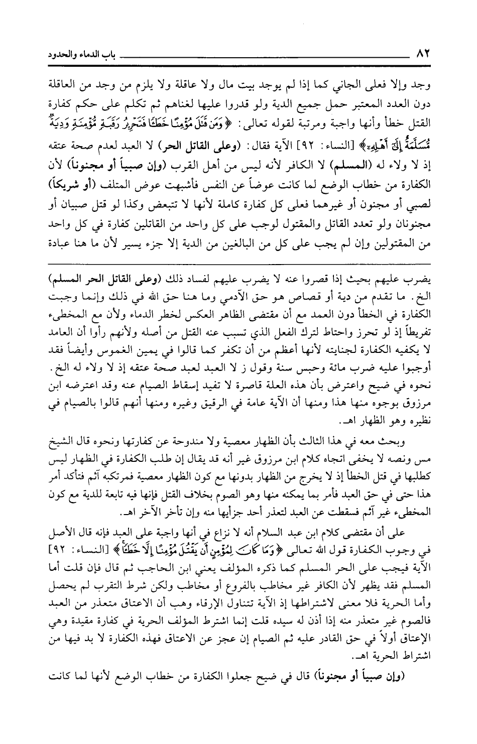 وجد وإلا فعلى الجاني كما إذا لم يوجد بيت مال ولا عاقلة ولا يلزم من وجد من العاقلة دون العدد المعتبر حمل جميع الدية ولو قدروا عليها لغناهم ثم تكلم على حكم كفارة القتل خطأ وأنها واجبة ومرتبة لقوله تعالى: {وَمَنْ قَتَلَ مُؤْمِنًا خَطَأً فَتَحْرِيرُ رَقَبَةٍ مُؤْمِنَةٍ وَدِيَةٌ مُسَلَّمَةٌ إِلَى أَهْلِهِ} [النساء: 92] الآية فقال: (وعلى القاتل الحر) لا العبد لعدم صحة عتقه إذ لا ولاء له (المسلم) لا الكافر لأنه ليس من أهل القرب (وإن صبيًّا أو مجنونًا) لأن الكفارة من خطاب الوضع لما كانت عوضًا عن النفس فأشبهت عوض المتلف (أو شريكًا) لصبي أو مجنون أو غيرهما فعلى كل كفارة كاملة لأنها لا تتبعض وكذا لو قتل صبيان أو مجنونان ولو تعدد القاتل والمقتول لوجب على كل واحد من القاتلين كفارة في كل واحد من المقتولين وإن لم يجب على كل من البالغين من الدية إلا جزء يسير لأن ما هنا عبادة