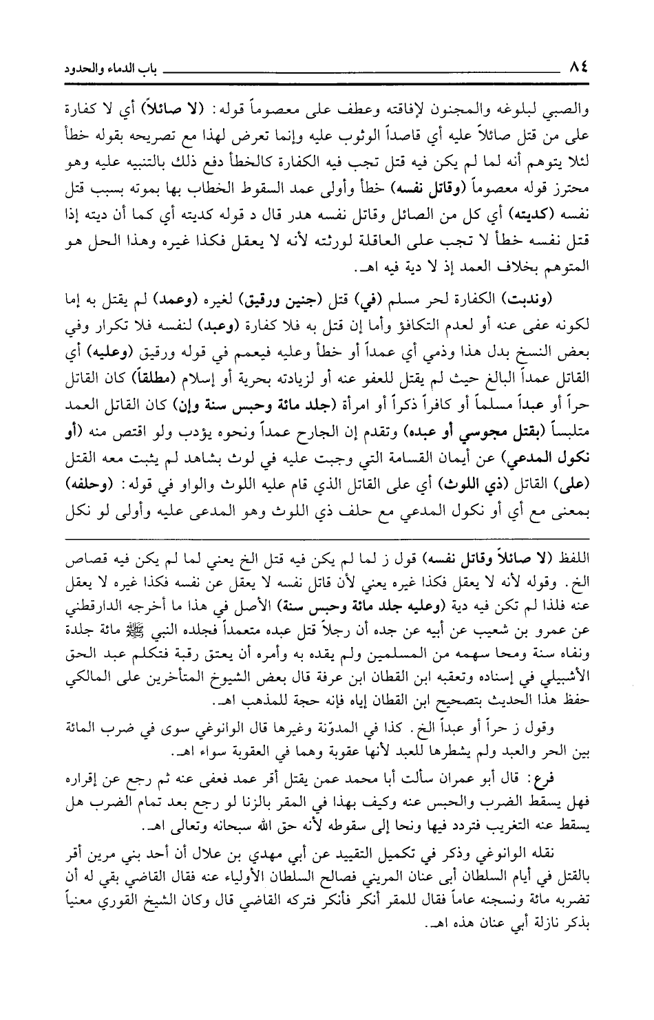 اللفظ (لا صائلًا وقاتل نفسه) قول ز لما لم يكن فيه قتل الخ يعني لما لم يكن فيه قصاص الخ. وقوله لأنه لا يعقل فكذا غيره يعني لأن قاتل نفسه لا يعقل عن نفسه فكذا غيره لا يعقل عنه فلذا لم تكن فيه دية (وعليه جلد مائة وحبس سنة) الأصل في هذا ما أخرجه الدارقطني عن عمرو بن شعيب عن أبيه عن جده أن رجلًا قتل عبده متعمدًا فجلده النبي - صلى الله عليه وسلم - مائة جلدة ونفاه سنة ومحا سهمه من المسلمين ولم يقده به وأمره أن يعتق رقبة فتكلم عبد الحق الأشبيلي في إسناده وتعقبه ابن القطان ابن عرفة قال بعض الشيوخ المتأخرين على المالكي حفظ هذا الحديث بتصحيح ابن القطان إياه فإنه حجة للمذهب اهـ.