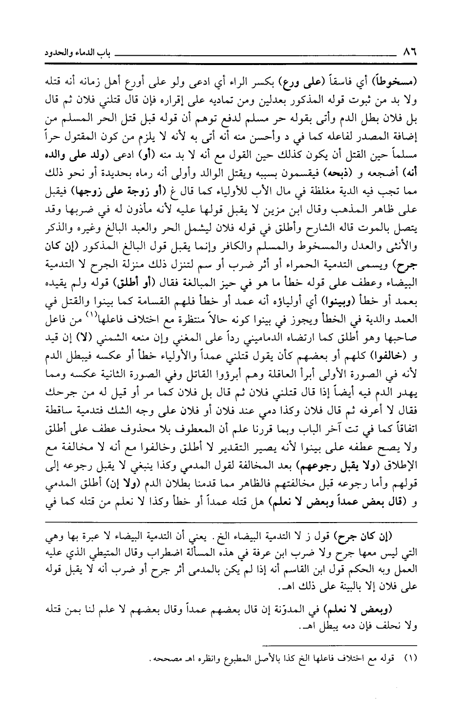 (مسخوطًا) أي فاسقًا (على ورع) بكسر الراء أي ادعى ولو على أورع أهل زمانه أنه قتله ولا بد من ثبوت قوله المذكور بعدلين ومن تماديه على إقراره فإن قال قتلني فلان ثم قال بل فلان بطل الدم وأتى بقوله حر مسلم لدفع توهم أن قوله قبل قتل الحر المسلم من إضافة المصدر لفاعله كما في د وأحسن منه أنه أتى به لأنه لا يلزم من كون المقتول حرًّا مسلمًا حين القتل أن يكون كذلك حين القول مع أنه لا بد منه (أو) ادعى (ولد على والده أنه) أضجعه و (ذبحه) فيقسمون بسببه ويقتل الوالد وأولى أنه رماه بحديدة أو نحو ذلك مما تجب فيه الدية مغلظة في مال الأب للأولياء كما قال غ (أو زوجة على زوجها) فيقبل على ظاهر المذهب وقال ابن مزين لا يقبل قولها عليه لأنه مأذون له في ضربها وقد يتصل بالموت قاله الشارح وأطلق في قوله فلان ليشمل الحر والعبد البالغ وغيره والذكر والأنثى والعدل والمسخوط والمسلم والكافر وإنما يقبل قول البالغ المذكور (إن كان جرح) ويسمى التدمية الحمراء أو أثر ضرب أو سم لتنزل ذلك منزلة الجرح لا التدمية البيضاء وعطف على قوله خطأ ما هو في حيز المبالغة فقال (أو أطلق) قوله ولم يقيده بعمد أو خطأ (وبينوا) أي أولياؤه أنه عمد أو خطأ فلهم القسامة كما بينوا والقتل في العمد والدية في الخطأ ويجوز في بينوا كونه حالًا منتظرة مع اختلاف فاعلها (¬1) من فاعل صاحبها وهو أطلق كما ارتضاه الدماميني ردًّا على المغني وإن متعه الشمني (لا) إن قيد و (خالفوا) كلهم أو بعضهم كأن يقول قتلني عمدًا والأولياء خطأ أو عكسه فيبطل الدم لأنه في الصورة الأولى أبرأ العاقلة وهم أبرؤوا القاتل وفي الصورة الثانية عكسه ومما يهدر الدم فيه أيضًا إذا قال قتلني فلان ثم قال بل فلان كما مر أو قيل له من جرحك فقال لا أعرفه ثم قال فلان وكذا دمي عند فلان أو فلان على وجه الشك فتدمية ساقطة اتفاقًا كما في تت آخر الباب وبما قررنا علم أن المعطوف بلا محذوف عطف على أطلق ولا يصح عطفه على بينوا لأنه يصير التقدير لا أطلق وخالفوا مع أنه لا مخالفة مع الإطلاق (ولا يقبل رجوعهم) بعد المخالفة لقول المدمي وكذا ينبغي لا يقبل رجوعه إلى قولهم وأما رجوعه قبل مخالفتهم فالظاهر مما قدمنا بطلان الدم (ولا إن) أطلق المدمي و (قال بعض عمدًا وبعض لا نعلم) هل قتله عمدًا أو خطأ وكذا لا نعلم من قتله كما في