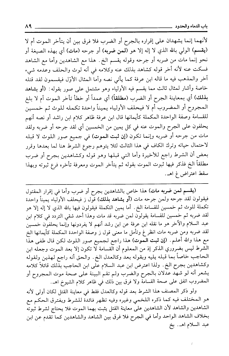 (يقسم لمن ضربه مات) هذا خاص بالشاهدين بجرح أو ضرب وأما في إقرار المقتول فيقولون لقد جرحه ولمن جرحه مات (أو يشاهد بذلك) قول ز فيحلف الأولياء يمينًا واحدة تكملة للوث ثم خمسين للقسامة الخ. أما يمين التكملة فيقولون فيها بالله الذي لا إله إلا هو لقد ضربه ثم خمسين للقسامة يقولون لمن ضربه قد مات وهذا أحد شقي التردد في كلام ابن عبد السلام والآخر هو ما نقله ابن عرفة عن ابن رشد أنهم لا يفردونها وإنما يحلفون خمسين لقد ضربه ومن ضربه مات انظر غ وتأمل ما معنى قول ز وصفة الواحدة المكملة كأيمانها الخ مع هذا والله أعلم. (إن ثبت الموت) هذا راجع لجميع صور اللوث لكن قال طفى هذا الشرط ليس بضروري الذكر إذ من المعلوم أن القسامة لا تكون إلا بعد الموت وجعله ابن الحاجب خاصًّا بما قبله يليه وبقوله بعد وكالعدل الخ. والحق أنه راجع لهذين ولقوله وكشاهدين بجرح الخ. ولذا اعترض ابن عبد السلام على ابن الحاجب بذلك قائلًا كلامه يشعر أنه لو شهد عدلان بالجرح والضرب ولم تقم البينة على صحة موت المجروح أو المضروب اتفق على صحة القسامة ولا فرق بين ذلك في ظاهر كلام الشيوخ اهـ.