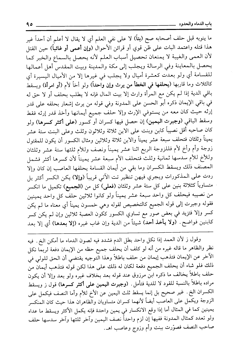 ما ينوبه قبل حلف أصحابه صح (بتًّا) لا على نفي العلم أي لا يقال لا أعلم أن أحدًا غير هذا قتله واعتمد الباب على ظن قوي أو قرائن الأحوال (وإن أعمى أو غائبًا) حين القتل لأن العمى والغيبة لا يمنعان تحصيل أسباب العلم لأنه يحصل بالسماع والخبر كما يحصل بالمعاينة وفي الرسالة ويجلب إلى مكة والمدينة وبيت المقدس أهل أعمالها للقسامة أي ولو بعدت كعشرة أميال ولا يجلب في غيرها إلا من الأميال اليسيرة أي كالثلاث وما قاربها (يحلفها في الخطأ من يرث وإن واحدًا) ولو أخًا لأم (أو امرأة) ويسقط باقي الدية إذا لم يكن مع المرأة وارث إلا بيت المال فإنه لا يطلب بحلف أو لا حق له في باقي الإيمان ذكره أبو الحسن على المدونة وفي قوله من يرث إشعار بحلفه على قدر إرثه حيث كان معه من يستوفي الإرث وإلا حلف جميع أيمانها وأخذ قدر إرثه فقط وسقط الباقي (وجبرت اليمين) إن حصل فيها كسران أو كسور (على أكثر كسرها) ولو كان صاحبه أقل نصيبًا كابن وبنت على الابن ثلاثة وثلاثون وثلث وعلى البنت ستة عشر يمينًا وثلثان فتحلف سبعة عشر يمينًا والابن ثلاثة وثلاثين ومثال الكسور أن يكون للمقتول زوجة وأم وأخ لأم فللزوجة الربع اثنا عشر يمينًا ونصف وللأم ثلثها ستة عشر وثلثان وللأخ للأم سدسها ثمانية وثلث فتحلف الأم سبعة عشر يمينًا لأن كسرها أكثر فشمل المصنف ذلك ويسقط الكسران وما بقي من أيمان القسامة يحلفها العاصب إن كان وإلا ردت على المذكورات ويجري فيهن تنظير تت الآتي قريبًا (وإلا) يكن الكسر أكثر بل متساويًا كثلاثة بنين على كل ستة عشر وثلثان (فعلى) كل من (الجميع) تكميل ما انكسر من نصيبه فيحلف كل واحد سبعة عشر يمينًا ولو كانوا ثلاثين حلف كل واحد يمينين فقوله وجبرت إلى قوله الجميع كالتخصيص لقوله وهي خمسون يمينًا أي معناه ما لم يكن كسر وإلا فتزيد في بعض صور مع تساوي الكسور ككون العصبة ثلاثين وإن لم يكن كسر كابنين فواضح. (ولا يأخذ أحد) شيئًا من الدية وإن غاب غيره (إلا بعدها) أي إلا بعد
