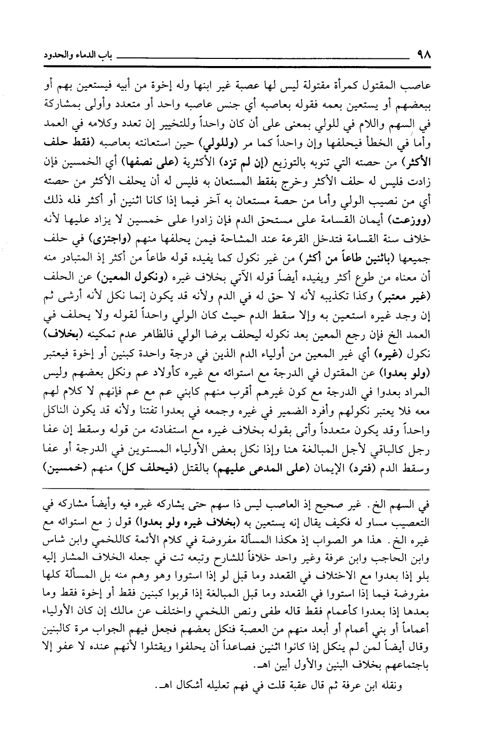 في السهم الخ. غير صحيح إذ العاصب ليس ذا سهم حتى يشاركه غيره فيه وأيضًا مشاركه في التعصيب مساو له فكيف يقال إنه يستعين به (بخلاف غيره ولو بعدوا) قول ز مع استوائه مع غيره الخ. هذا هو الصواب إذ هكذا المسألة مفروضة في كلام الأئمة كاللخمي وابن شاس وابن الحاجب وابن عرفة وغير واحد خلافًا للشارح وتبعه تت في جعله الخلاف المشار إليه بلو إذا يعدوا مع الاختلاف في القعدد وما قبل لو إذا استووا وهو وهم منه بل المسألة كلها مفروضة فيما إذا استووا في القعدد وما قبل المبالغة إذا قربوا كبنين فقط أو إخوة فقط وما بعدها إذا بعدوا كأعمام فقط قاله طفى ونص اللخمي واختلف عن مالك إن كان الأولياء أعمامًا أو بني أعمام أو أبعد منهم من العصبة فنكل بعضهم فجعل فيهم الجواب مرة كالبنين وقال أيضًا لمن لم ينكل إذا كانوا اثنين فصاعدًا أن يحلفوا ويقتلوا لأنهم عنده لا عفو إلا باجتماعهم بخلاف البنين والأول أبين اهـ.