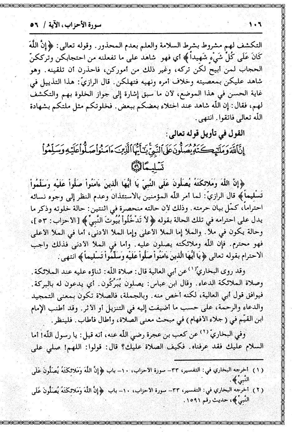 (2) أخرجه البخاري في: التفسير، 33- سورة الأحزاب، 10- باب إِنَّ اللَّهَ وَمَلائِكَتَهُ يُصَلُّونَ عَلَى النَّبِيِّ، حديث رقم 1591.