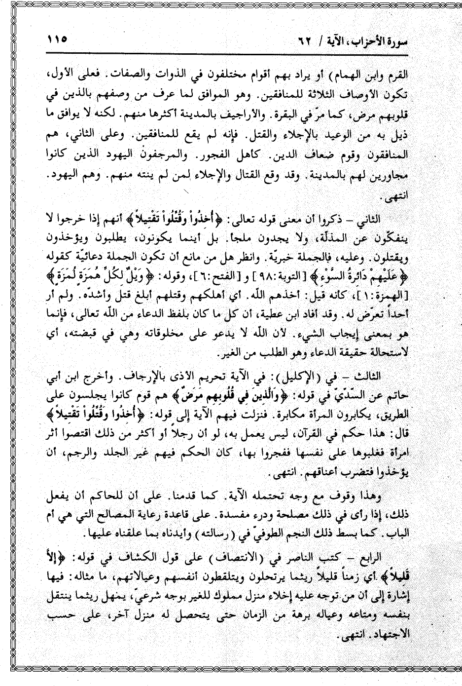 الثالث- في (الإكليل) : في الآية تحريم الأذى بالإرجاف. وأخرج ابن أبي حاتم عن السّدّيّ في قوله: وَالَّذِينَ فِي قُلُوبِهِمْ مَرَضٌ هم قوم كانوا يجلسون على الطريق، يكابرون المرأة مكابرة. فنزلت فيهم الآية إلى قوله: أُخِذُوا وَقُتِّلُوا تَقْتِيلًا قال: هذا حكم في القرآن، ليس يعمل به، لو أن رجلا أو أكثر من ذلك اقتصوا أثر امرأة فغلبوها على نفسها ففجروا بها، كان الحكم فيهم غير الجلد والرجم، أن يؤخذوا فتضرب أعناقهم. انتهى.