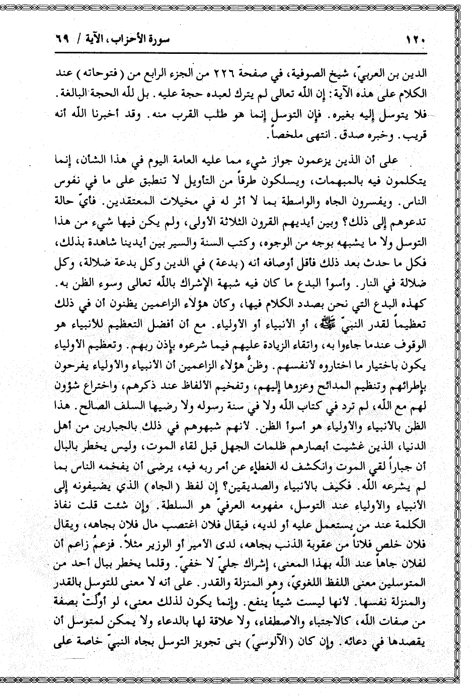 كهذه البدع التي نحن بصدد الكلام فيها، وكأن هؤلاء الزاعمين يظنون أن في ذلك تعظيما لقدر النبيّ صلّى الله عليه وسلّم، أو الأنبياء أو الأولياء. مع أن أفضل التعظيم للأنبياء هو الوقوف عند ما جاءوا به، واتقاء الزيادة عليهم فيما شرعوه بإذن ربهم. وتعظيم الأولياء يكون باختيار ما اختاروه لأنفسهم. وظنّ هؤلاء الزاعمين أن الأنبياء والأولياء يفرحون بإطرائهم وتنظيم المدائح وعزوها إليهم، وتفخيم الألفاظ عند ذكرهم، واختراع شؤون لهم مع الله، لم ترد في كتاب الله ولا في سنة رسوله ولا رضيها السلف الصالح. هذا الظن بالأنبياء والأولياء هو أسوأ الظن. لأنهم شبهوهم في ذلك بالجبارين من أهل الدنيا، الذين غشيت أبصارهم ظلمات الجهل قبل لقاء الموت، وليس يخطر بالبال أن جبارا لقي الموت وانكشف له الغطاء عن أمر ربه فيه، يرضى أن يفخمه الناس بما لم يشرعه الله. فكيف بالأنبياء والصديقين؟ إن لفظ (الجاه) الذي يضيفونه إلى الأنبياء والأولياء عند التوسل، مفهومه العرفيّ هو السلطة. وإن شئت قلت نفاذ الكلمة عند من يستعمل عليه أو لديه، فيقال فلان اغتصب مال فلان بجاهه، ويقال فلان خلص فلانا من عقوبة الذنب بجاهه، لدى الأمير أو الوزير مثلا. فزعم زاعم أن لفلان جاها عند الله بهذا المعنى، إشراك جليّ لا خفيّ. وقلما يخطر ببال أحد من المتوسلين معنى اللفظ اللغويّ، وهو المنزلة والقدر. على أنه لا معنى للتوسل بالقدر والمنزلة نفسها. لأنها ليست شيئا ينفع. وإنما يكون لذلك معنى، لو أوّلت بصفة من صفات الله، كالاجتباء والاصطفاء، ولا علاقة لها بالدعاء ولا يمكن لمتوسل أن يقصدها في دعائه. وإن كان (الآلوسيّ) بنى تجويز التوسل بجاه النبيّ خاصة على