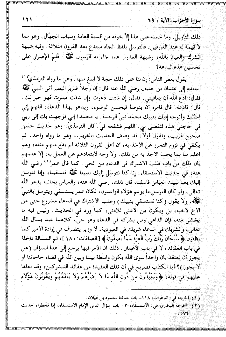 قال الترمذيّ: وهو حديث حسن صحيح غريب، ونقول أولا: قد وصف الحديث بالغريب، وهو ما رواه واحد. ثم يكفي في لزوم التحرز عن الأخذ به، أن أهل القرون الثلاثة لم يقع منهم مثله، وهم أعلم منا بما يجب الأخذ به من ذلك. ولا وجه لابتعادهم عن العمل به، إلا علمهم بأن ذلك من باب طلب الاشتراك في الدعاء من الحي. كما قال عمر «2» رضي الله عنه، في حديث الاستسقاء: إنا كنا نتوسل إليك بنبينا صلّى الله عليه وسلّم فتسقينا، وإنا نتوسل إليك بعم نبيك العباس فاسقنا، قال ذلك، رضي الله عنه، والعباس بجانبه يدعو الله تعالى، ولو كان التوسل ما يزعم هؤلاء الزاعمون، لكان عمر يستسقي ويتوسل بالنبيّ صلّى الله عليه وسلّم، ولا يقول (كنا نستسقي بنبيك) وطلب الاشتراك في الدعاء مشروع حتى من الأخ لأخيه، بل ويكون من الأعلى للأدنى، كما ورد في الحديث. وليس فيه ما يخشى منه، فإن الداعي ومن يشركه في الدعاء وهو حيّ، كلاهما عبد يسأل الله تعالى، والشريك في الدعاء شريك في العبودية، لا وزير يتصرف في إرادة الأمير كما يظنون سُبْحانَ رَبِّكَ رَبِّ الْعِزَّةِ عَمَّا يَصِفُونَ [الصافات: 180] ، ثم المسألة داخلة في باب العقائد، لا في باب الأعمال. ذلك أن الأمر فيها يرجع إلى هذا السؤال (هل يجوز أن نعتقد بأن واحدا سوى الله يكون واسطة بيننا وبين الله في قضاء حاجاتنا أو لا يجوز) ؟ أما الكتاب فصريح في أن تلك العقيدة من عقائد المشركين، وقد نعاها عليهم في قوله: وَيَعْبُدُونَ مِنْ دُونِ اللَّهِ ما لا يَضُرُّهُمْ وَلا يَنْفَعُهُمْ وَيَقُولُونَ هؤُلاءِ