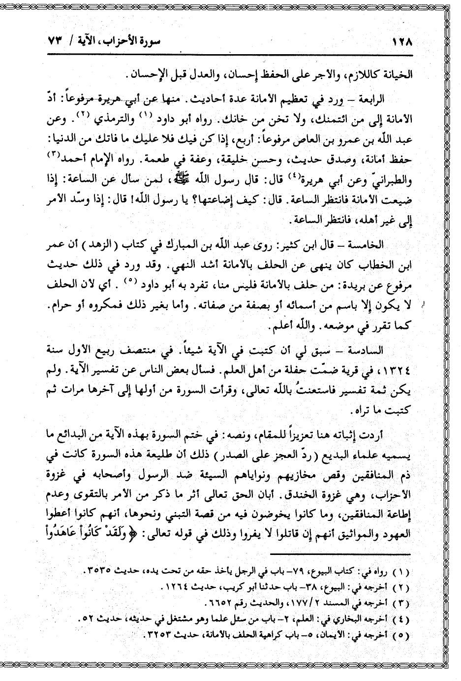 الخامسة- قال ابن كثير: روى عبد الله بن المبارك في كتاب (الزهد) أن عمر ابن الخطاب كان ينهى عن الحلف بالأمانة أشد النهي.