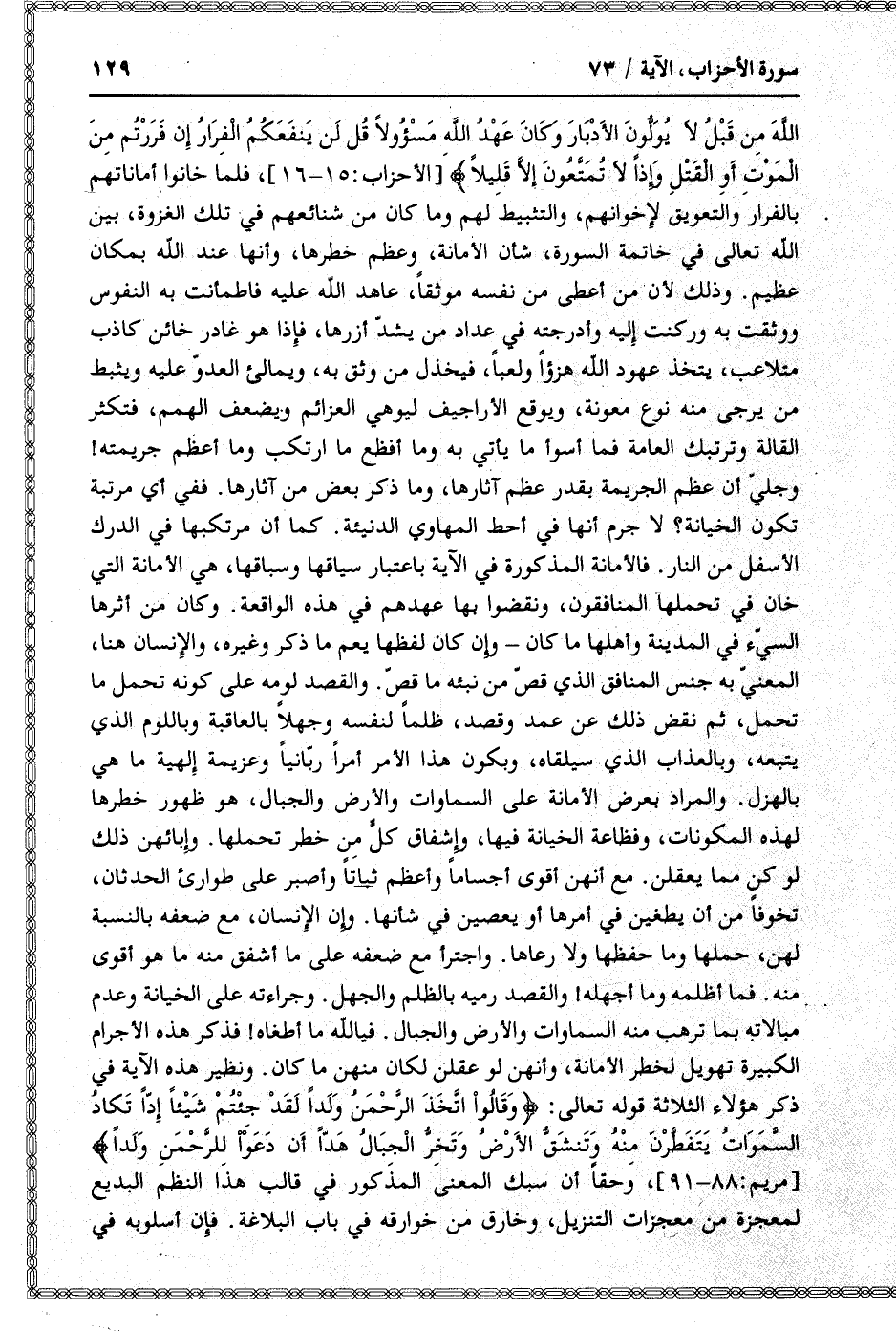 وَلَقَدْ كانُوا عاهَدُوا اللَّهَ مِنْ قَبْلُ لا يُوَلُّونَ الْأَدْبارَ وَكانَ عَهْدُ اللَّهِ مَسْؤُلًا قُلْ لَنْ يَنْفَعَكُمُ الْفِرارُ إِنْ فَرَرْتُمْ مِنَ الْمَوْتِ أَوِ الْقَتْلِ وَإِذاً لا تُمَتَّعُونَ إِلَّا قَلِيلًا [الأحزاب: 15- 16] ، فلما خانوا أماناتهم بالفرار والتعويق لإخوانهم، والتثبيط لهم وما كان من شنائعهم في تلك الغزوة، بين الله تعالى في خاتمة السورة، شأن الأمانة، وعظم خطرها، وأنها عند الله بمكان عظيم. وذلك لأن من أعطى من نفسه موثقا، عاهد الله عليه فاطمأنت به النفوس ووثقت به وركنت إليه وأدرجته في عداد من يشدّ أزرها، فإذا هو غادر خائن كاذب متلاعب، يتخذ عهود الله هزؤا ولعبا، فيخذل من وثق به، ويمالئ العدوّ عليه ويثبط من يجرى منه نوع معونة، ويوقع الأراجيف ليوهي العزائم ويضعف الهمم، فتكثر القالة وترتبك العامة فما أسوأ ما يأتي به وما أفظع ما ارتكب وما أعظم جريمته! وجليّ أن عظم الجريمة بقدر عظم آثارها، وما ذكر بعض من آثارها. ففي أي مرتبة تكون الخيانة؟ لا جرم أنها في أحط المهاوي الدنيئة. كما أن مرتكبها في الدرك الأسفل من النار. فالأمانة المذكورة في الآية باعتبار سياقها وسباقها، هي الأمانة التي خان في تحملها المنافقون، ونقضوا بها عهدهم في هذه الواقعة. وكان من أثرها السيّئ في المدينة وأهلها ما كان- وإن كان لفظها يعم ما ذكر وغيره، والإنسان هنا، المعنيّ به جنس المنافق الذي قصّ من نبئه ما قصّ. والقصد لومه على كونه تحمل ما تحمل، ثم نقض ذلك عن عمد وقصد، ظلما لنفسه وجهلا بالعاقبة وباللوم الذي يتبعه، وبالعذاب الذي سيلقاه، وبكون هذا الأمر أمرا ربّانيا وعزيمة إلهية ما هي بالهزل. والمراد بعرض الأمانة على السماوات والأرض والجبال، هو ظهور خطرها لهذه المكونات، وفظاعة الخيانة فيها، وإشفاق كلّ من خطر تحملها. وإبائهن ذلك لو كن مما يعقلن. مع أنهن أقوى أجساما وأعظم ثباتا وأصبر على طوارئ الحدثان، تخوفا من أن يطغين في أمرها أو يعصين في شأنها. وإن الإنسان، مع ضعفه بالنسبة لهن، حملها وما حفظها ولا رعاها. واجترأ مع ضعفه على ما أشفق منه ما هو أقوى منه. فما أظلمه وما أجهله! والقصد رميه بالظلم والجهل. وجراءته على الخيانة وعدم مبالاته بما ترهب منه السماوات والأرض والجبال. فيا لله ما أطغاه! فذكر هذه الأجرام الكبيرة تهويل لخطر الأمانة، وأنهن لو عقلن لكان منهن ما كان. ونظير هذه الآية في ذكر هؤلاء الثلاثة قوله تعالى: وَقالُوا اتَّخَذَ الرَّحْمنُ وَلَداً لَقَدْ جِئْتُمْ شَيْئاً إِدًّا تَكادُ السَّماواتُ يَتَفَطَّرْنَ مِنْهُ وَتَنْشَقُّ الْأَرْضُ وَتَخِرُّ الْجِبالُ هَدًّا أَنْ دَعَوْا لِلرَّحْمنِ وَلَداً [مريم: 88- 91] ، وحقا أن سبك المعنى المذكور في قالب هذا النظم البديع لمعجزة من معجزات التنزيل، وخارق من خوارقه في باب البلاغة. فإن أسلوبه في