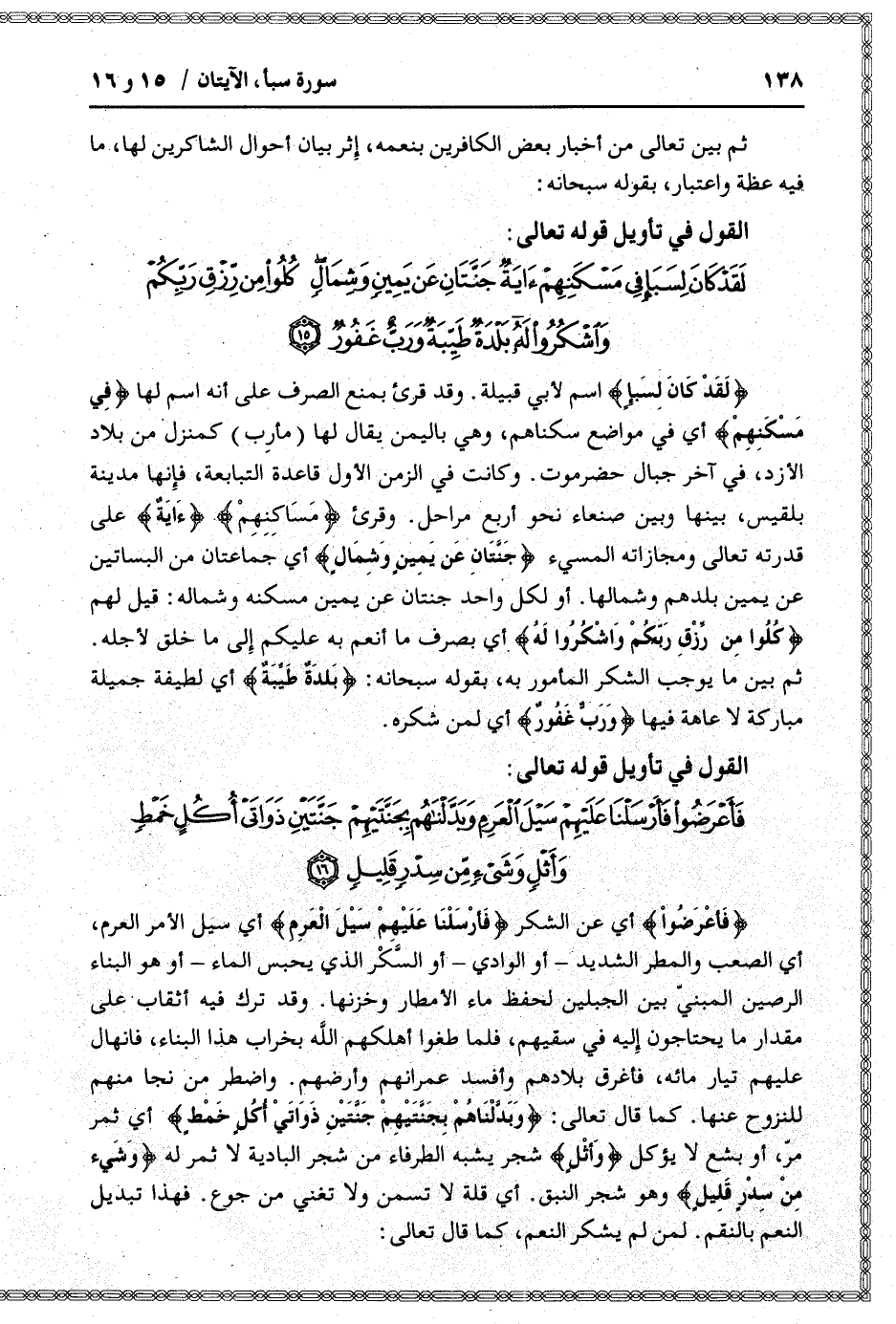 لَقَدْ كانَ لِسَبَإٍ فِي مَسْكَنِهِمْ آيَةٌ جَنَّتانِ عَنْ يَمِينٍ وَشِمالٍ كُلُوا مِنْ رِزْقِ رَبِّكُمْ وَاشْكُرُوا لَهُ بَلْدَةٌ طَيِّبَةٌ وَرَبٌّ غَفُورٌ (15)