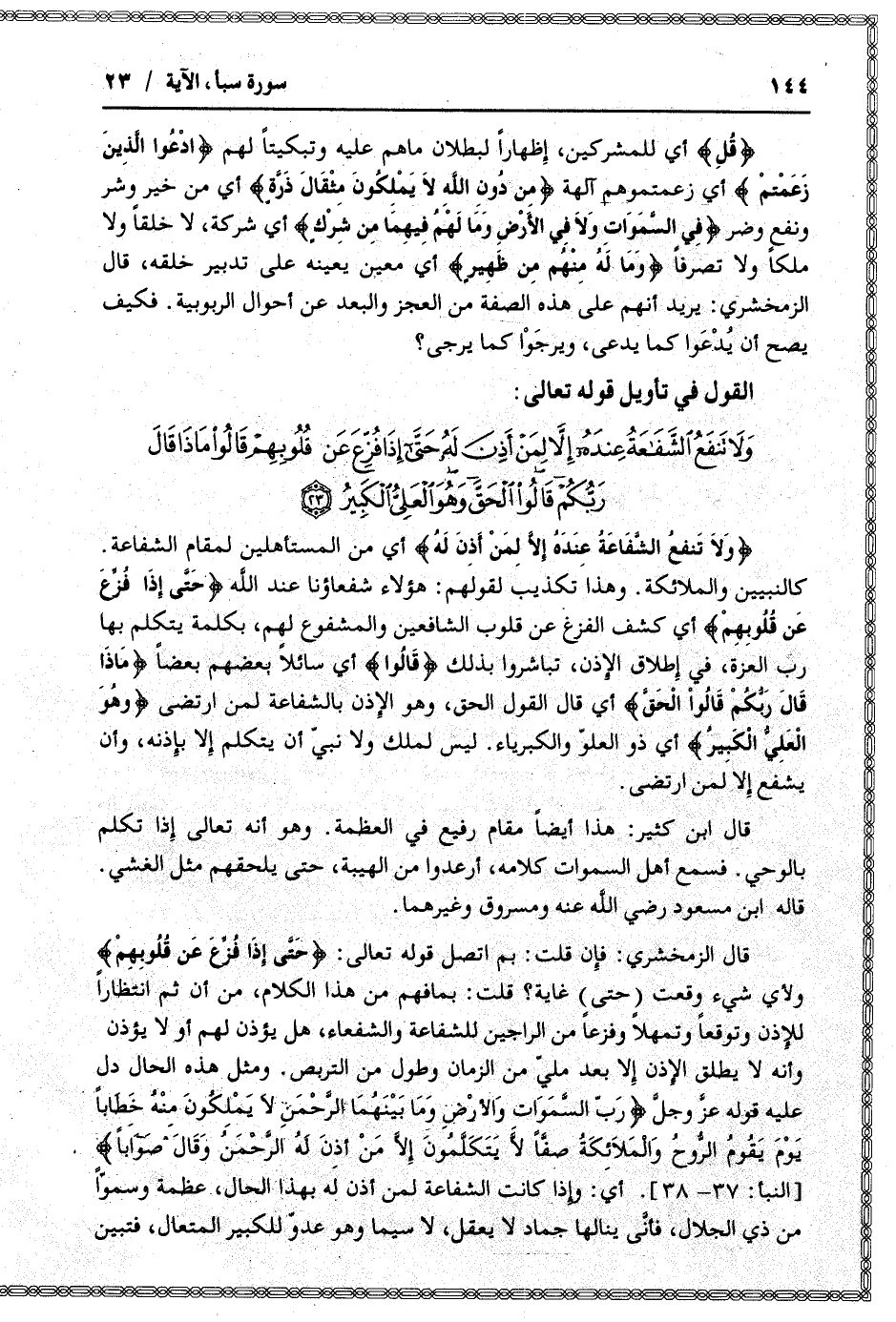 وَلا تَنْفَعُ الشَّفاعَةُ عِنْدَهُ إِلاَّ لِمَنْ أَذِنَ لَهُ حَتَّى إِذا فُزِّعَ عَنْ قُلُوبِهِمْ قالُوا ماذا قالَ رَبُّكُمْ قالُوا الْحَقَّ وَهُوَ الْعَلِيُّ الْكَبِيرُ (23)