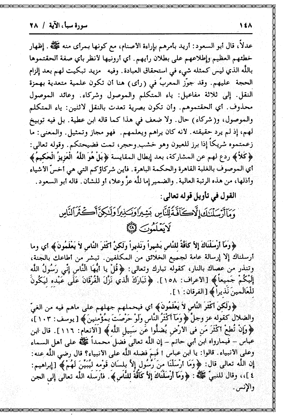 وَما أَرْسَلْناكَ إِلاَّ كَافَّةً لِلنَّاسِ بَشِيراً وَنَذِيراً وَلكِنَّ أَكْثَرَ النَّاسِ لا يَعْلَمُونَ (28)