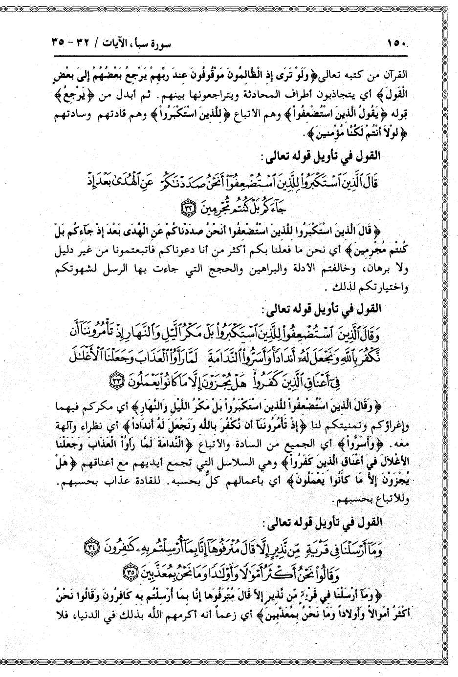 وَقالَ الَّذِينَ اسْتُضْعِفُوا لِلَّذِينَ اسْتَكْبَرُوا بَلْ مَكْرُ اللَّيْلِ وَالنَّهارِ أي مكركم فيهما وإغراؤكم وتمنيتكم لنا إِذْ تَأْمُرُونَنا أَنْ نَكْفُرَ بِاللَّهِ وَنَجْعَلَ لَهُ أَنْداداً أي نظراء وآلهة معه. وَأَسَرُّوا أي الجميع من السادة والأتباع النَّدامَةَ لَمَّا رَأَوُا الْعَذابَ وَجَعَلْنَا الْأَغْلالَ فِي أَعْناقِ الَّذِينَ كَفَرُوا وهي السلاسل التي تجمع أيديهم مع أعناقهم هَلْ يُجْزَوْنَ إِلَّا ما كانُوا يَعْمَلُونَ أي بأعمالهم كلّ بحسبه. للقادة عذاب بحسبهم.