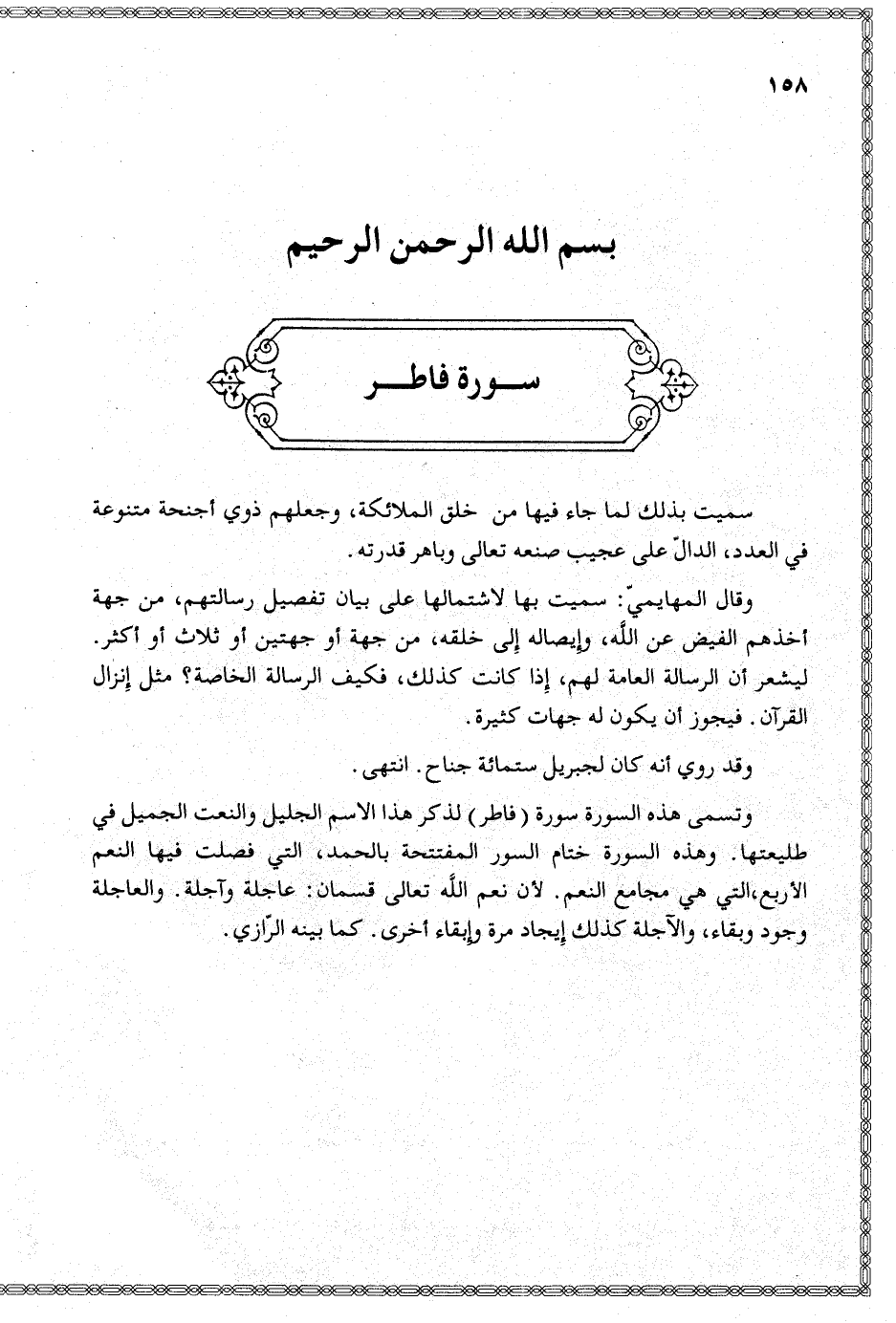 وتسمى هذه السورة سورة (فاطر) لذكر هذا الاسم الجليل والنعت الجميل في طليعتها. وهذه السورة ختام السور المفتتحة بالحمد، التي فصلت فيها النعم الأربع، التي هي مجامع النعم. لأن نعم الله تعالى قسمان: عاجلة وآجلة. والعاجلة وجود وبقاء، والآجلة كذلك إيجاد مرة وإبقاء أخرى. كما بينه الرّازي.