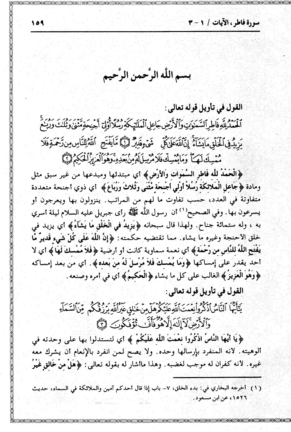 الْحَمْدُ لِلَّهِ فاطِرِ السَّماواتِ وَالْأَرْضِ أي مبتدئها ومبدعها من غير سبق مثل ومادة جاعِلِ الْمَلائِكَةِ رُسُلًا أُولِي أَجْنِحَةٍ مَثْنى وَثُلاثَ وَرُباعَ أي ذوي أجنحة متعددة متفاوتة في العدد، حسب تفاوت ما لهم من المراتب. ينزلون بها ويعرجون أو يسرعون بها.