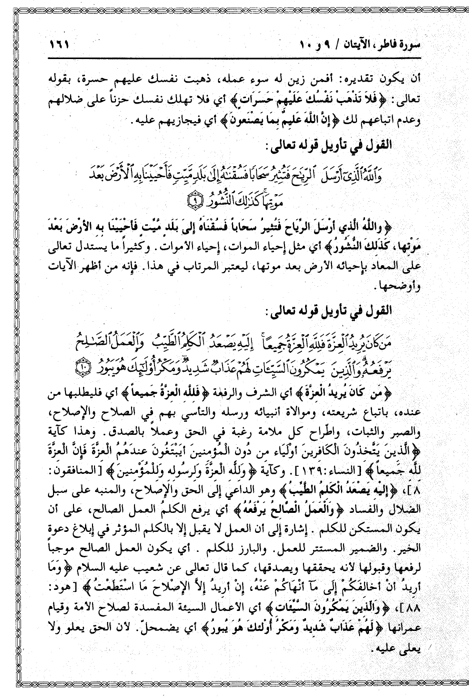 مَنْ كانَ يُرِيدُ الْعِزَّةَ فَلِلَّهِ الْعِزَّةُ جَمِيعاً إِلَيْهِ يَصْعَدُ الْكَلِمُ الطَّيِّبُ وَالْعَمَلُ الصَّالِحُ يَرْفَعُهُ وَالَّذِينَ يَمْكُرُونَ السَّيِّئاتِ لَهُمْ عَذابٌ شَدِيدٌ وَمَكْرُ أُولئِكَ هُوَ يَبُورُ (10)