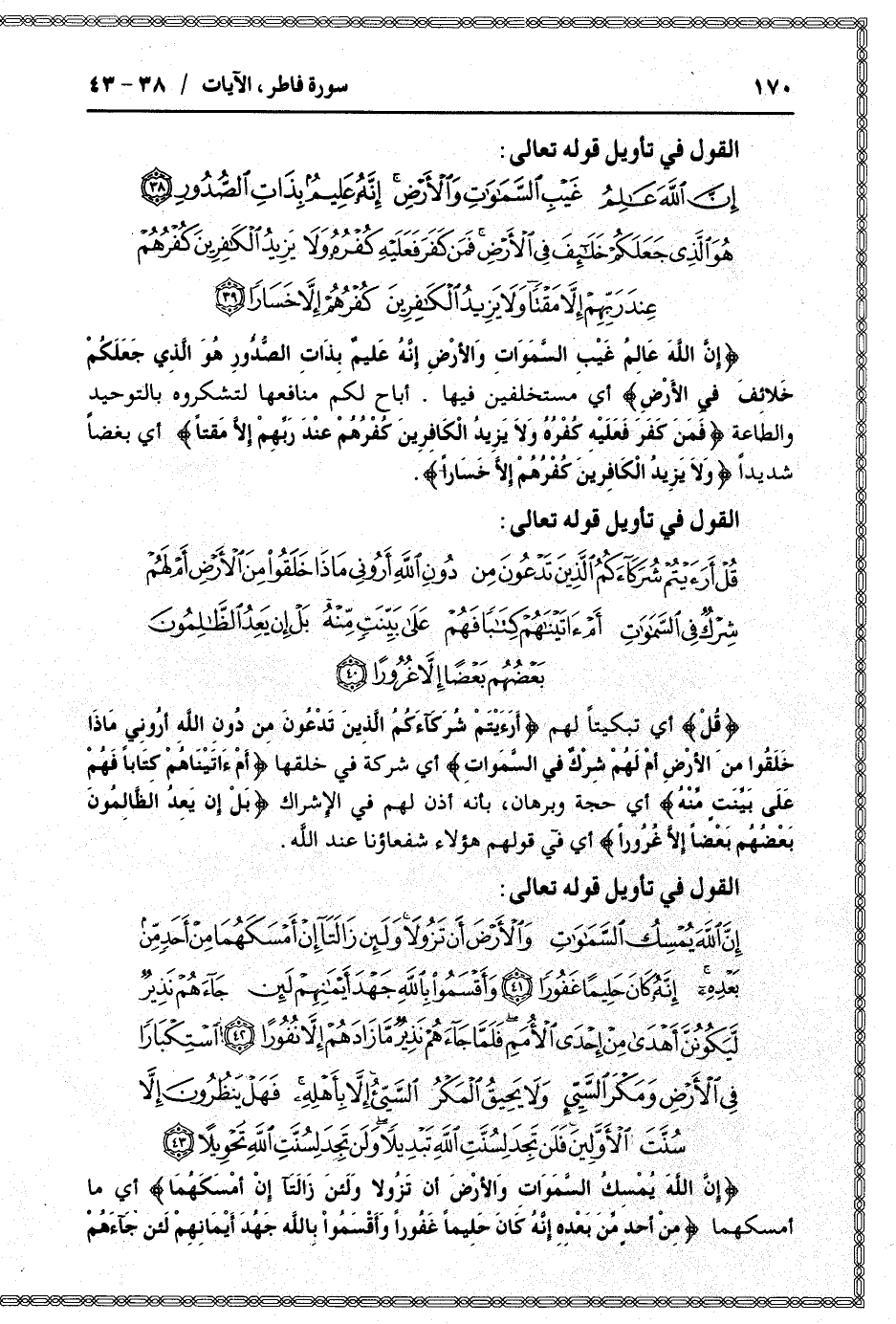 إِنَّ اللَّهَ يُمْسِكُ السَّماواتِ وَالْأَرْضَ أَنْ تَزُولا وَلَئِنْ زالَتا إِنْ أَمْسَكَهُما مِنْ أَحَدٍ مِنْ بَعْدِهِ إِنَّهُ كانَ حَلِيماً غَفُوراً (41) وَأَقْسَمُوا بِاللَّهِ جَهْدَ أَيْمانِهِمْ لَئِنْ جاءَهُمْ نَذِيرٌ لَيَكُونُنَّ أَهْدى مِنْ إِحْدَى الْأُمَمِ فَلَمَّا جاءَهُمْ نَذِيرٌ ما زادَهُمْ إِلاَّ نُفُوراً (42) اسْتِكْباراً فِي الْأَرْضِ وَمَكْرَ السَّيِّئِ وَلا يَحِيقُ الْمَكْرُ السَّيِّئُ إِلاَّ بِأَهْلِهِ فَهَلْ يَنْظُرُونَ إِلاَّ سُنَّتَ الْأَوَّلِينَ فَلَنْ تَجِدَ لِسُنَّتِ اللَّهِ تَبْدِيلاً وَلَنْ تَجِدَ لِسُنَّتِ اللَّهِ تَحْوِيلاً (43)