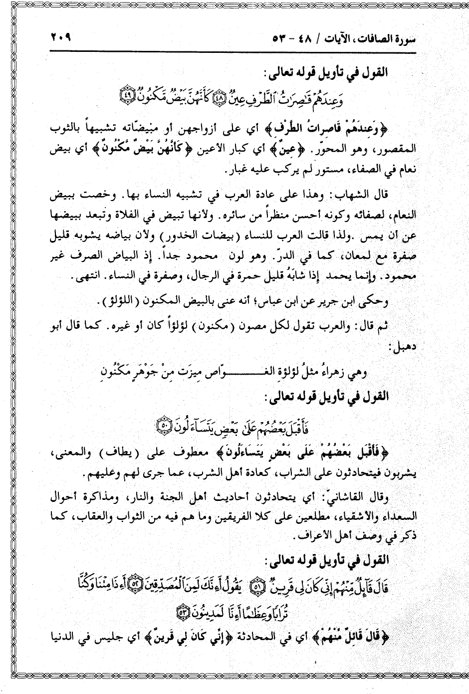 وَعِنْدَهُمْ قاصِراتُ الطَّرْفِ أي على أزواجهن أو مبيضّاته تشبيها بالثوب المقصور، وهو المحوّر. عِينٌ أي كبار الأعين كَأَنَّهُنَّ بَيْضٌ مَكْنُونٌ أي بيض نعام في الصفاء، مستور لم يركب عليه غبار.