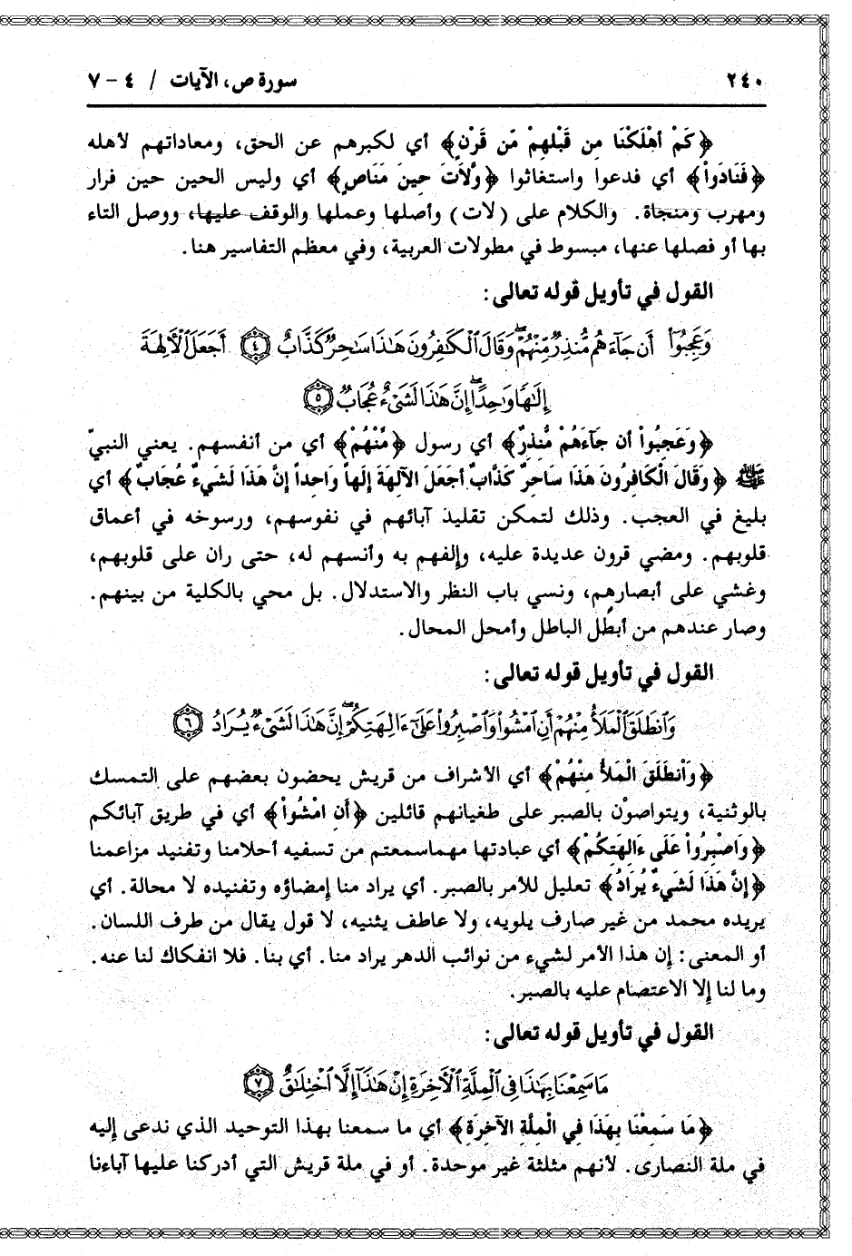 كَمْ أَهْلَكْنا مِنْ قَبْلِهِمْ مِنْ قَرْنٍ أي لكبرهم عن الحق، ومعاداتهم لأهله فَنادَوْا أي فدعوا واستغاثوا وَلاتَ حِينَ مَناصٍ أي وليس الحين حين فرار ومهرب ومنجاة. والكلام على (لات) وأصلها وعملها والوقف عليها، ووصل التاء بها أو فصلها عنها، مبسوط في مطولات العربية، وفي معظم التفاسير هنا.