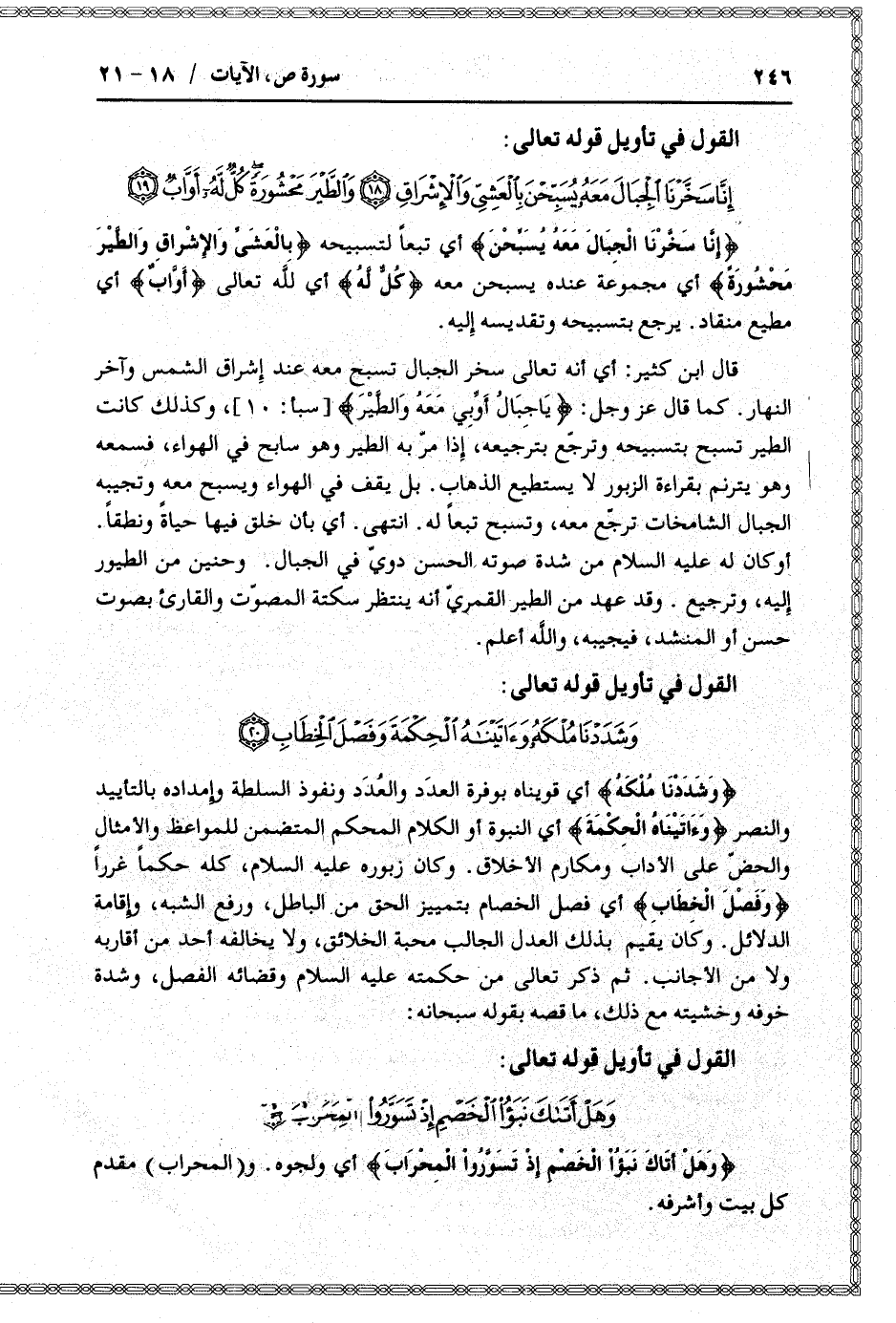 إِنَّا سَخَّرْنَا الْجِبالَ مَعَهُ يُسَبِّحْنَ أي تبعا لتسبيحه بِالْعَشِيِّ وَالْإِشْراقِ وَالطَّيْرَ مَحْشُورَةً أي مجموعة عنده يسبحن معه كُلٌّ لَهُ أي لله تعالى أَوَّابٌ أي مطيع منقاد. يرجع بتسبيحه وتقديسه إليه.
