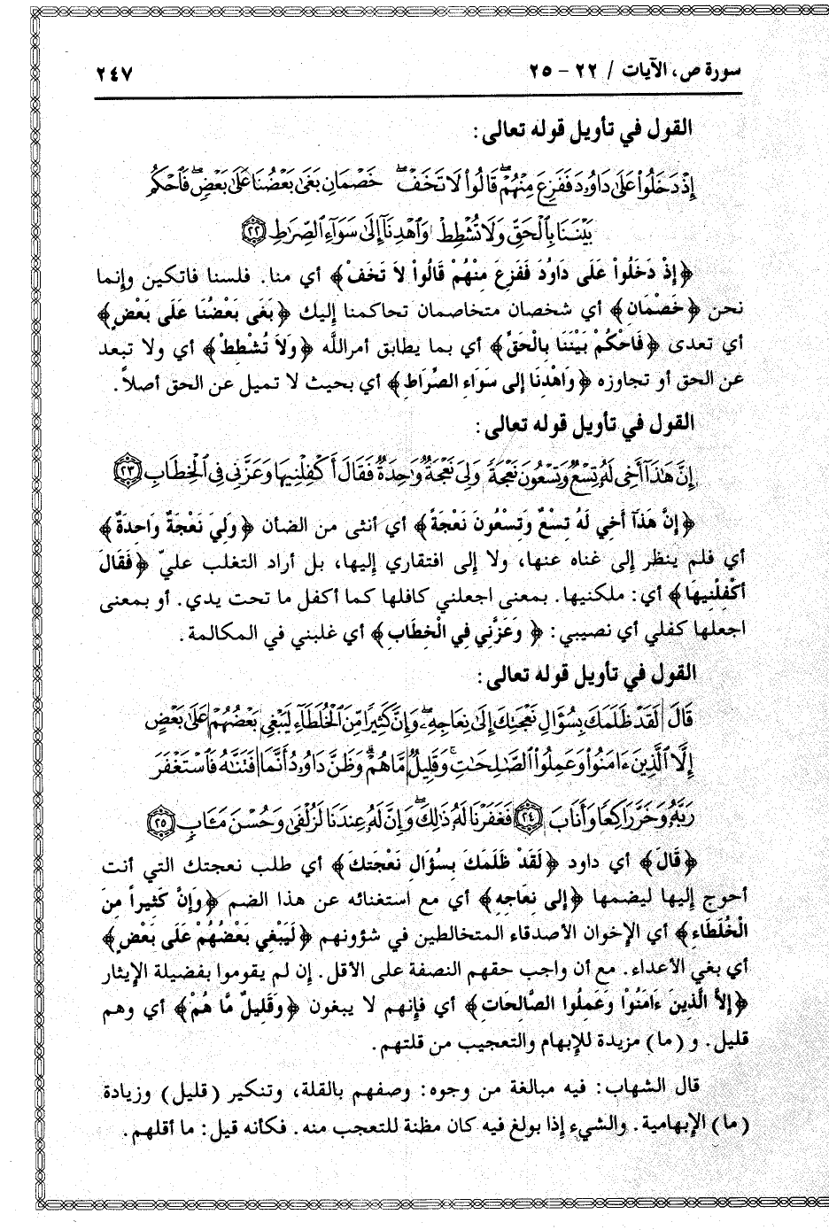 إِنَّ هذا أَخِي لَهُ تِسْعٌ وَتِسْعُونَ نَعْجَةً أي أنثى من الضأن وَلِيَ نَعْجَةٌ واحِدَةٌ أي فلم ينظر إلى غناه عنها، ولا إلى افتقاري إليها، بل أراد التغلب عليّ فَقالَ أَكْفِلْنِيها أي: ملكنيها. بمعنى اجعلني كافلها كما أكفل ما تحت يدي. أو بمعنى اجعلها كفلي أي نصيبي: وَعَزَّنِي فِي الْخِطابِ أي غلبني في المكالمة.