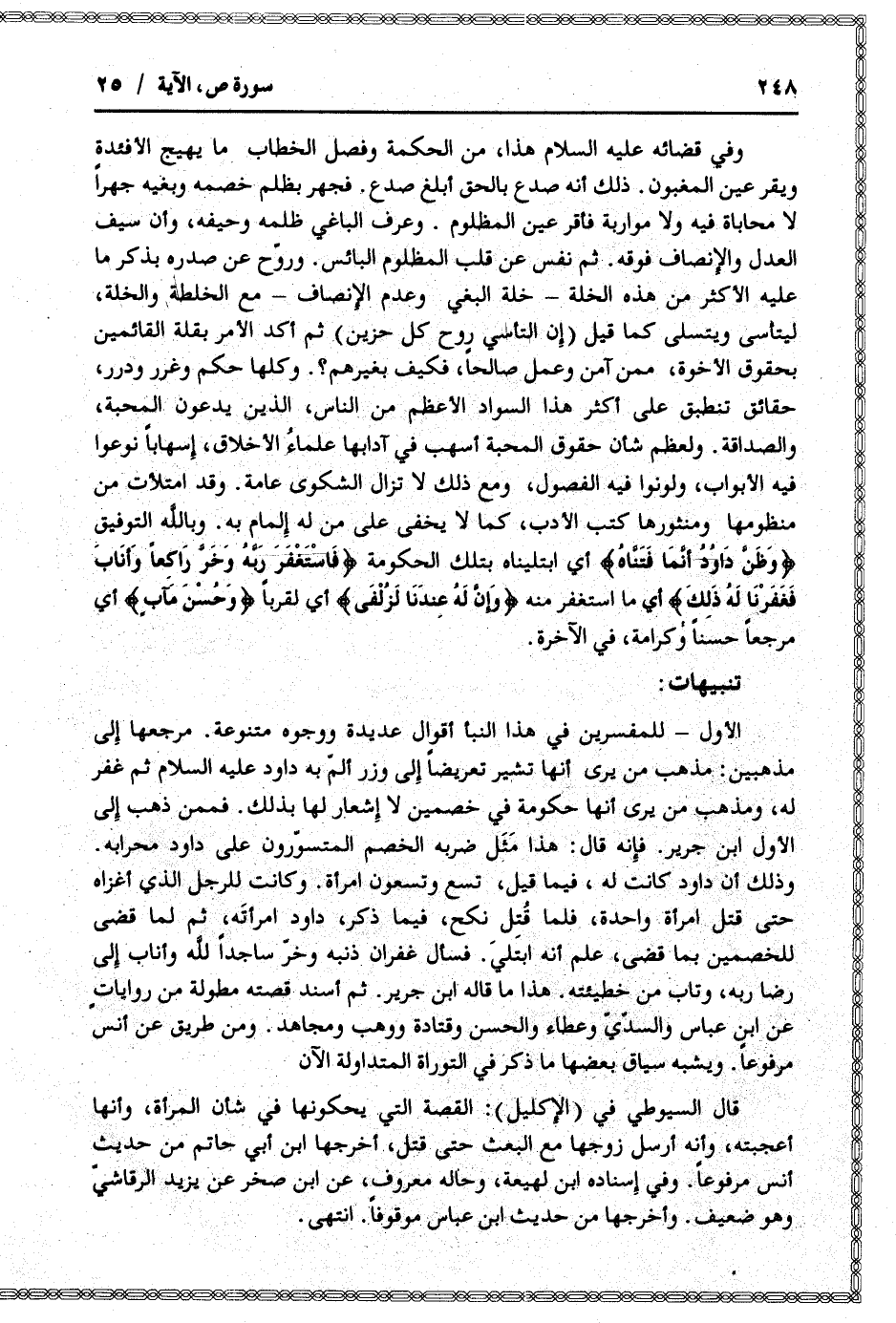 وفي قضائه عليه السلام هذا، من الحكمة وفصل الخطاب ما يهيج الأفئدة ويقر عين المغبون. ذلك أنه صدع بالحق أبلغ صدع. فجهر بظلم خصمه وبغيه جهرا لا محاباة فيه ولا مواربة فأقر عين المظلوم. وعرف الباغي ظلمه وحيفه، وأن سيف العدل والإنصاف فوقه. ثم نفس عن قلب المظلوم البائس. وروّح عن صدره بذكر ما عليه الأكثر من هذه الخلة- خلة البغي وعدم الإنصاف- مع الخلطة والخلة، ليتأسى ويتسلى كما قيل (إن التأسي روح كل حزين) ثم أكد الأمر بقلة القائمين بحقوق الأخوة، ممن آمن وعمل صالحا، فكيف بغيرهم؟. وكلها حكم وغرر ودرر، حقائق تنطبق على أكثر هذا السواد الأعظم من الناس، الذين يدعون المحبة، والصداقة. ولعظم شأن حقوق المحبة أسهب في آدابها علماء الأخلاق، إسهابا نوعوا فيه الأبواب، ولونوا فيه الفصول، ومع ذلك لا تزال الشكوى عامة. وقد امتلأت من منظومها ومنثورها كتب الأدب، كما لا يخفى على من له إلمام به. وبالله التوفيق وَظَنَّ داوُدُ أَنَّما فَتَنَّاهُ أي ابتليناه بتلك الحكومة فَاسْتَغْفَرَ رَبَّهُ وَخَرَّ راكِعاً وَأَنابَ فَغَفَرْنا لَهُ ذلِكَ أي ما استغفر منه وَإِنَّ لَهُ عِنْدَنا لَزُلْفى أي لقربا وَحُسْنَ مَآبٍ أي مرجعا حسنا وكرامة، في الآخرة.