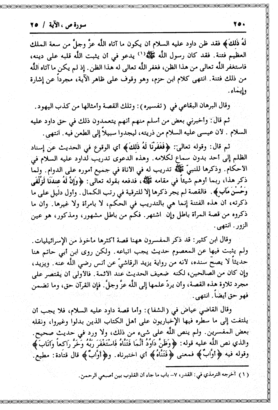 وقال القاضي عياض في (الشفا) : وأما قصة داود عليه السلام، فلا يجب أن يلتفت إلى ما سطره فيها الأخباريون على أهل الكتاب الذين بدلوا وغيروا، ونقله بعض المفسرين. ولم ينص الله على شيء من ذلك، ولا ورد في حديث صحيح.