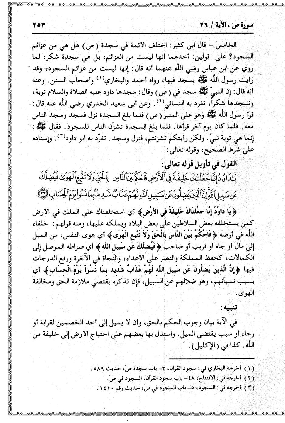 يا داوُدُ إِنَّا جَعَلْناكَ خَلِيفَةً فِي الْأَرْضِ أي استخلفناك على الملك في الأرض كمن يستخلفه بعض السلاطين على بعض البلاد ويملكه عليها، ومنه قولهم: خلفاء الله في أرضه فَاحْكُمْ بَيْنَ النَّاسِ بِالْحَقِّ وَلا تَتَّبِعِ الْهَوى أي هوى النفس، من الميل إلى مال أو جاه أو قريب أو صاحب فَيُضِلَّكَ عَنْ سَبِيلِ اللَّهِ أي صراطه الموصل إلى الكمالات، كحفظ المملكة والنصر على الأعداء، والنجاة في الآخرة ورفع الدرجات فيها إِنَّ الَّذِينَ يَضِلُّونَ عَنْ سَبِيلِ اللَّهِ لَهُمْ عَذابٌ شَدِيدٌ بِما نَسُوا يَوْمَ الْحِسابِ أي بسبب نسيانهم، وهو ضلالهم عن السبيل، فإن تذكره يقتضي ملازمة الحق ومخالفة الهوى.