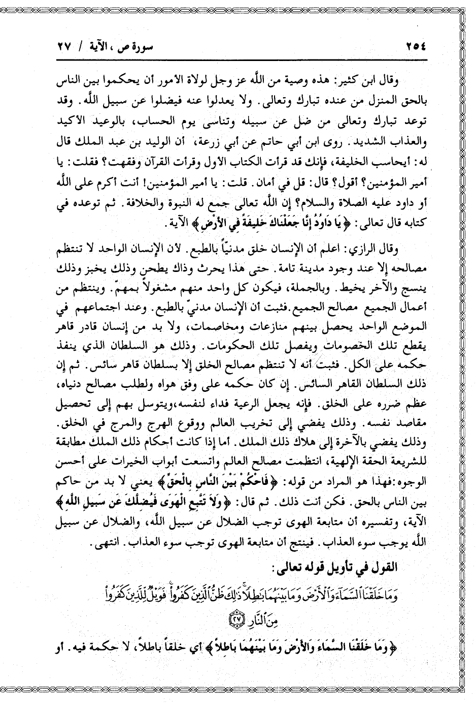 وذلك يفضي بالآخرة إلى هلاك ذلك الملك. أما إذا كانت أحكام ذلك الملك مطابقة للشريعة الحقة الإلهية، انتظمت مصالح العالم واتسعت أبواب الخيرات على أحسن الوجوه: فهذا هو المراد من قوله: فَاحْكُمْ بَيْنَ النَّاسِ بِالْحَقِّ يعني لا بد من حاكم بين الناس بالحق. فكن أنت ذلك. ثم قال: وَلا تَتَّبِعِ الْهَوى فَيُضِلَّكَ عَنْ سَبِيلِ اللَّهِ الآية، وتفسيره أن متابعة الهوى توجب الضلال عن سبيل الله، والضلال عن سبيل الله يوجب سوء العذاب. فينتج أن متابعة الهوى توجب سوء العذاب. انتهى.