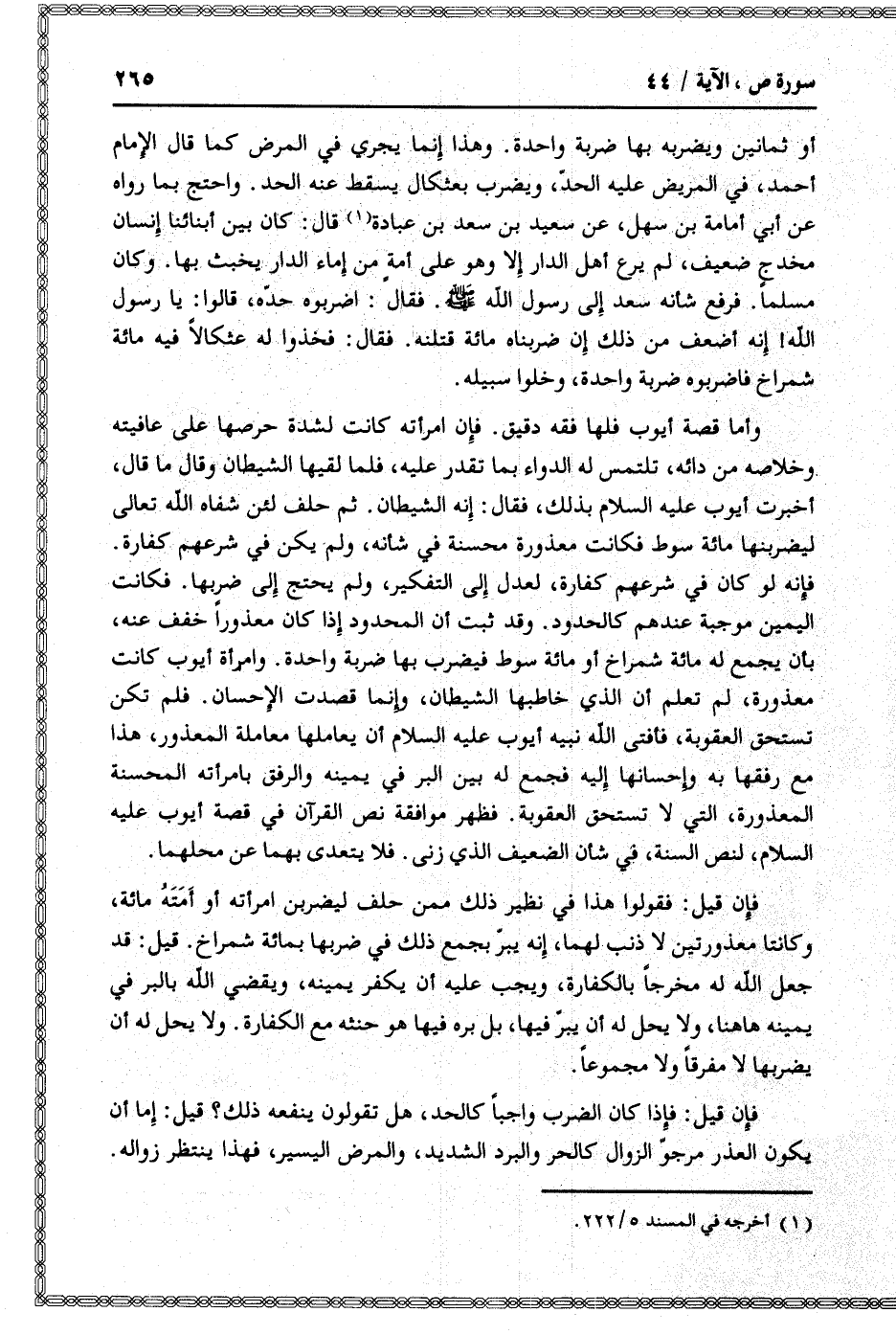 فإنه لو كان في شرعهم كفارة، لعدل إلى التفكير، ولم يحتج إلى ضربها. فكانت اليمين موجبة عندهم كالحدود. وقد ثبت أن المحدود إذا كان معذورا خفف عنه، بأن يجمع له مائة شمراخ أو مائة سوط فيضرب بها ضربة واحدة. وامرأة أيوب كانت معذورة، لم تعلم أن الذي خاطبها الشيطان، وإنما قصدت الإحسان. فلم تكن تستحق العقوبة، فأفتى الله نبيه أيوب عليه السلام أن يعاملها معاملة المعذور، هذا مع رفقها به وإحسانها إليه فجمع له بين البر في يمينه والرفق بامرأته المحسنة المعذورة، التي لا تستحق العقوبة. فظهر موافقة نص القرآن في قصة أيوب عليه السلام، لنص السنة، في شأن الضعيف الذي زنى. فلا يتعدى بهما عن محلهما.