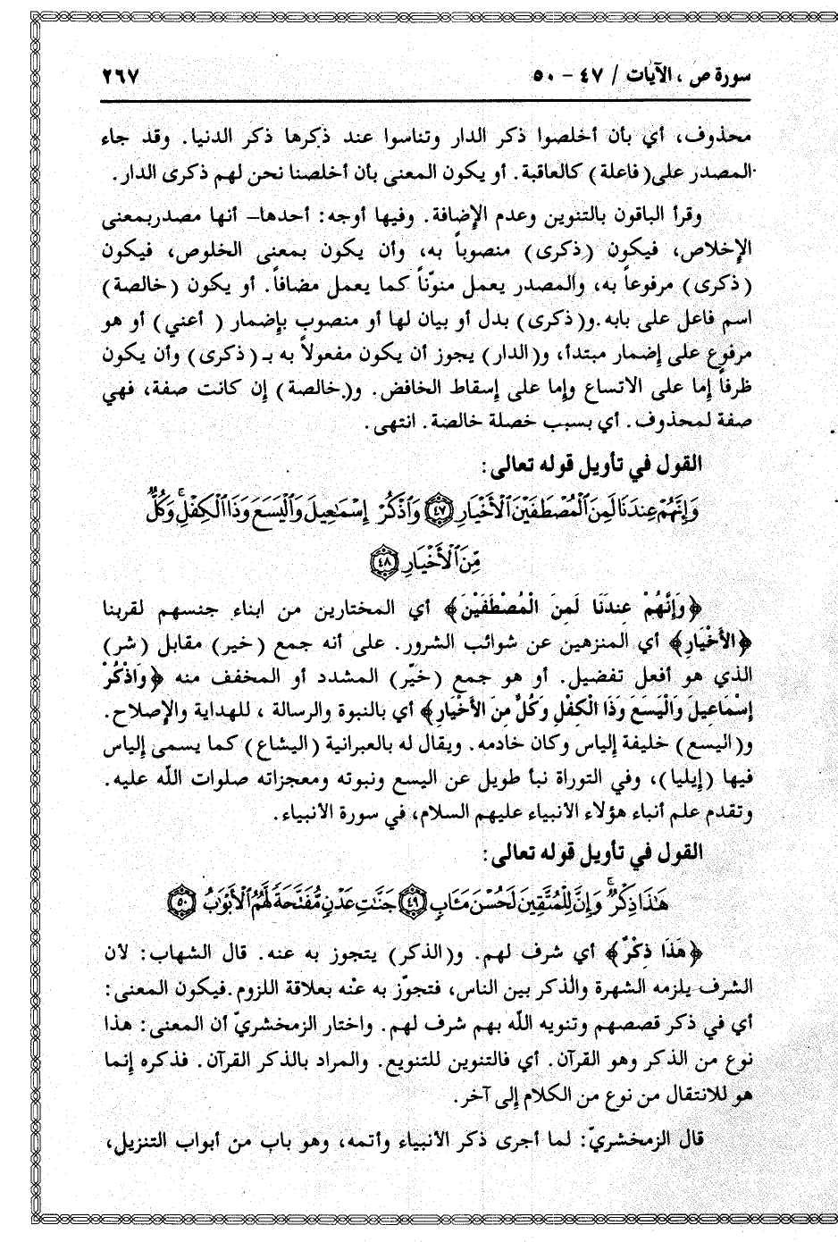 وَإِنَّهُمْ عِنْدَنا لَمِنَ الْمُصْطَفَيْنَ أي المختارين من أبناء جنسهم لقربنا الْأَخْيارِ أي المنزهين عن شوائب الشرور. على أنه جمع (خير) مقابل (شر) الذي هو أفعل تفضيل. أو هو جمع (خيّر) المشدد أو المخفف منه وَاذْكُرْ إِسْماعِيلَ وَالْيَسَعَ وَذَا الْكِفْلِ وَكُلٌّ مِنَ الْأَخْيارِ أي بالنبوة والرسالة، للهداية والإصلاح.