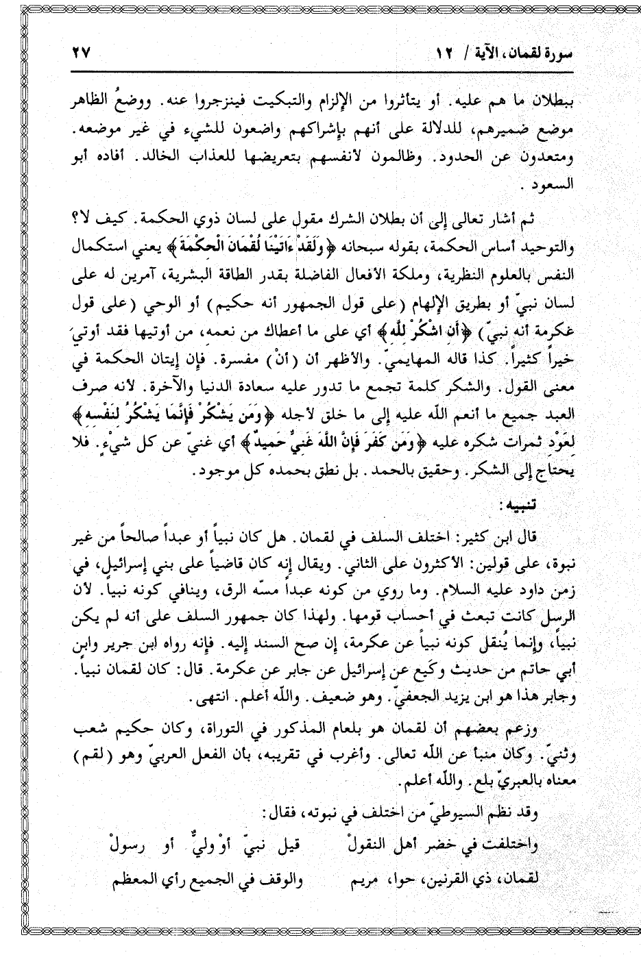 والتوحيد أساس الحكمة، بقوله سبحانه وَلَقَدْ آتَيْنا لُقْمانَ الْحِكْمَةَ يعني استكمال النفس بالعلوم النظرية، وملكة الأفعال الفاضلة بقدر الطاقة البشرية، آمرين له على لسان نبيّ أو بطريق الإلهام (على قول الجمهور أنه حكيم) أو الوحي (على قول عكرمة أنه نبيّ) أَنِ اشْكُرْ لِلَّهِ أي على ما أعطاك من نعمه، من أوتيها فقد أوتي خيرا كثيرا. كذا قاله المهايميّ. والأظهر أن (أن) مفسرة. فإن إتيان الحكمة في معنى القول. والشكر كلمة تجمع ما تدور عليه سعادة الدنيا والآخرة. لأنه صرف العبد جميع ما أنعم الله عليه إلى ما خلق لأجله وَمَنْ يَشْكُرْ فَإِنَّما يَشْكُرُ لِنَفْسِهِ لعود ثمرات شكره عليه وَمَنْ كَفَرَ فَإِنَّ اللَّهَ غَنِيٌّ حَمِيدٌ أي غنيّ عن كل شيء. فلا يحتاج إلى الشكر. وحقيق بالحمد. بل نطق بحمده كل موجود.