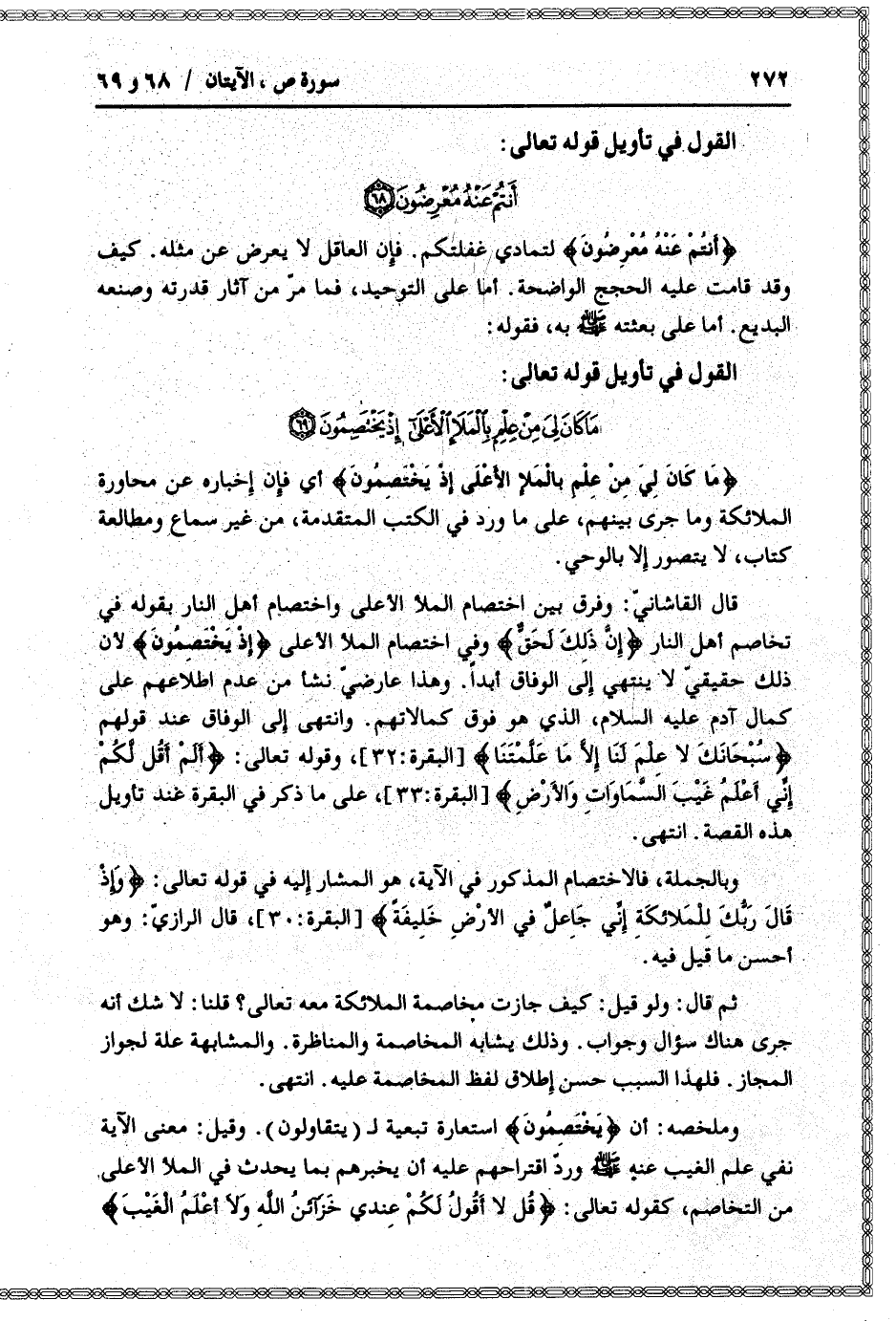 وملخصه: أن يَخْتَصِمُونَ استعارة تبعية ل (يتقاولون) . وقيل: معنى الآية نفي علم الغيب عنه صلّى الله عليه وسلّم وردّ اقتراحهم عليه أن يخبرهم بما يحدث في الملأ الأعلى من التخاصم، كقوله تعالى: قُلْ لا أَقُولُ لَكُمْ عِنْدِي خَزائِنُ اللَّهِ وَلا أَعْلَمُ الْغَيْبَ