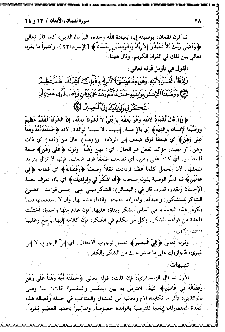وَإِذْ قالَ لُقْمانُ لِابْنِهِ وَهُوَ يَعِظُهُ يا بُنَيَّ لا تُشْرِكْ بِاللَّهِ، إِنَّ الشِّرْكَ لَظُلْمٌ عَظِيمٌ وَوَصَّيْنَا الْإِنْسانَ بِوالِدَيْهِ أي بالإحسان إليهما، لا سيما الوالدة. لأنه حَمَلَتْهُ أُمُّهُ وَهْناً عَلى وَهْنٍ أي ضعفا فوق ضعف إلى الولادة. و (وهنا) حال من (أمه) أي ذات وهن. أو مصدر مؤكد لفعل هو الحال. أي: تهن وهنا. وقوله عَلى وَهْنٍ صفة للمصدر. أي كائنا على وهن. أي تضعف ضعفا فوق ضعف. فإنها لا تزال يتزايد ضعفها. لأن الحمل كلما عظم ازدادت ثقلا وضعفا وَفِصالُهُ أي فطامه فِي عامَيْنِ ثم فسّر الوصية بقوله سبحانه أَنِ اشْكُرْ لِي وَلِوالِدَيْكَ أي بأن تعرف نعمة الإحسان وتقدره قدره. قال في (البصائر) : الشكر مبني على خمس قواعد: خضوع الشاكر للمشكور. وحبه له. واعترافه بنعمته. والثناء عليه بها. وأن لا يستعملها فيما يكره. هذه الخمسة هي أساس الشكر وبناؤه عليها. فإن عدم منها واحدة، اختلّت قاعدة من قواعد الشكر. وكل من تكلم في الشكر، فإن كلامه إليها يرجع وعليها يدور. انتهي.