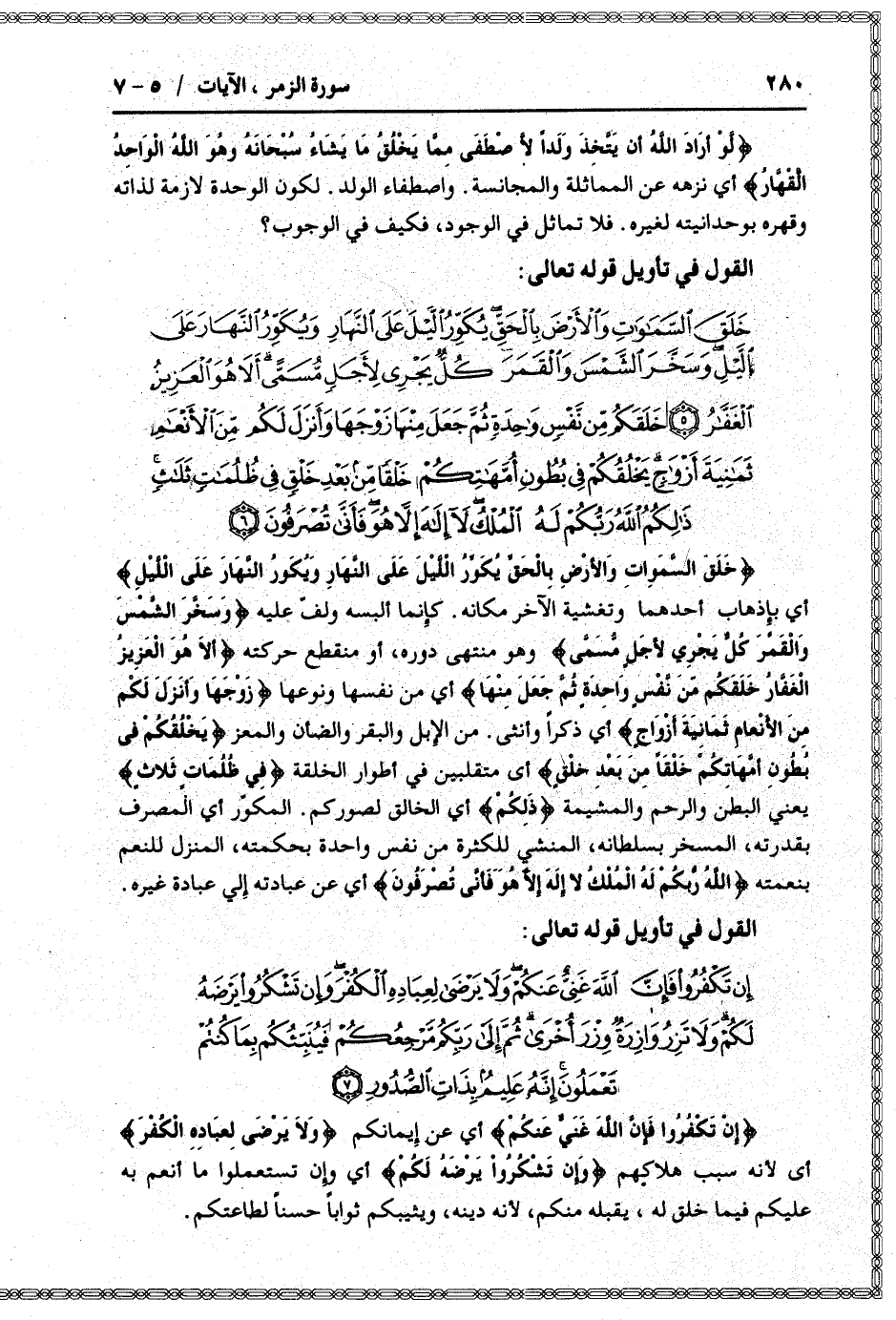 خَلَقَ السَّماواتِ وَالْأَرْضَ بِالْحَقِّ يُكَوِّرُ اللَّيْلَ عَلَى النَّهارِ وَيُكَوِّرُ النَّهارَ عَلَى اللَّيْلِ أي بإذهاب أحدهما وتغشية الآخر مكانه. كأنما ألبسه ولفّ عليه وَسَخَّرَ الشَّمْسَ وَالْقَمَرَ كُلٌّ يَجْرِي لِأَجَلٍ مُسَمًّى وهو منتهى دوره، أو منقطع حركته أَلا هُوَ الْعَزِيزُ الْغَفَّارُ خَلَقَكُمْ مِنْ نَفْسٍ واحِدَةٍ ثُمَّ جَعَلَ مِنْها أي من نفسها ونوعها زَوْجَها وَأَنْزَلَ لَكُمْ مِنَ الْأَنْعامِ ثَمانِيَةَ أَزْواجٍ أي ذكرا وأنثى. من الإبل والبقر والضأن والمعز يَخْلُقُكُمْ فِي بُطُونِ أُمَّهاتِكُمْ خَلْقاً مِنْ بَعْدِ خَلْقٍ أى متقلبين في أطوار الخلقة فِي ظُلُماتٍ ثَلاثٍ يعني البطن والرحم والمشيمة ذلِكُمُ أي الخالق لصوركم. المكوّر أي المصرف بقدرته، المسخر بسلطانه، المنشي للكثرة من نفس واحدة بحكمته، المنزل للنعم بنعمته اللَّهُ رَبُّكُمْ لَهُ الْمُلْكُ لا إِلهَ إِلَّا هُوَ فَأَنَّى تُصْرَفُونَ أي عن عبادته إلي عبادة غيره.