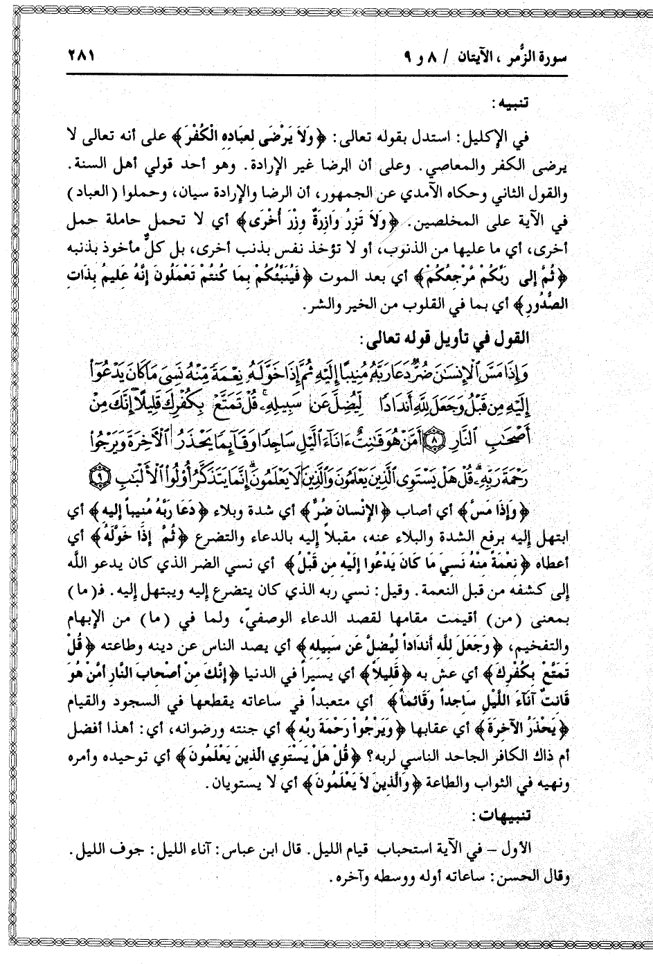 وَإِذا مَسَّ الْإِنْسانَ ضُرٌّ دَعا رَبَّهُ مُنِيباً إِلَيْهِ ثُمَّ إِذا خَوَّلَهُ نِعْمَةً مِنْهُ نَسِيَ ما كانَ يَدْعُوا إِلَيْهِ مِنْ قَبْلُ وَجَعَلَ لِلَّهِ أَنْداداً لِيُضِلَّ عَنْ سَبِيلِهِ قُلْ تَمَتَّعْ بِكُفْرِكَ قَلِيلاً إِنَّكَ مِنْ أَصْحابِ النَّارِ (8) أَمَّنْ هُوَ قانِتٌ آناءَ اللَّيْلِ ساجِداً وَقائِماً يَحْذَرُ الْآخِرَةَ وَيَرْجُوا رَحْمَةَ رَبِّهِ قُلْ هَلْ يَسْتَوِي الَّذِينَ يَعْلَمُونَ وَالَّذِينَ لا يَعْلَمُونَ إِنَّما يَتَذَكَّرُ أُولُوا الْأَلْبابِ (9)