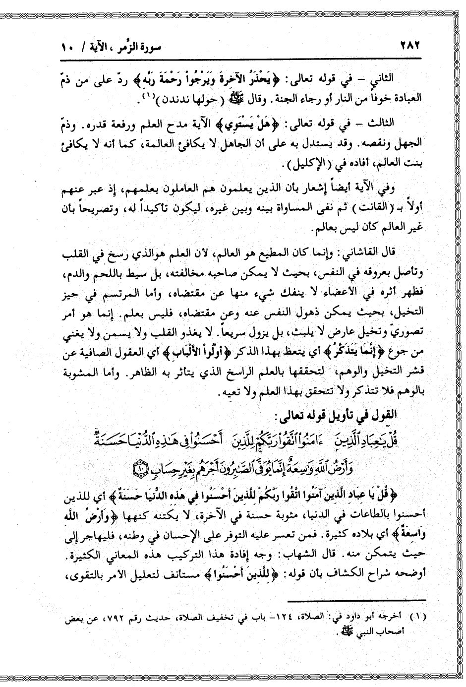 قُلْ يا عِبادِ الَّذِينَ آمَنُوا اتَّقُوا رَبَّكُمْ لِلَّذِينَ أَحْسَنُوا فِي هذِهِ الدُّنْيا حَسَنَةٌ وَأَرْضُ اللَّهِ واسِعَةٌ إِنَّما يُوَفَّى الصَّابِرُونَ أَجْرَهُمْ بِغَيْرِ حِسابٍ (10)