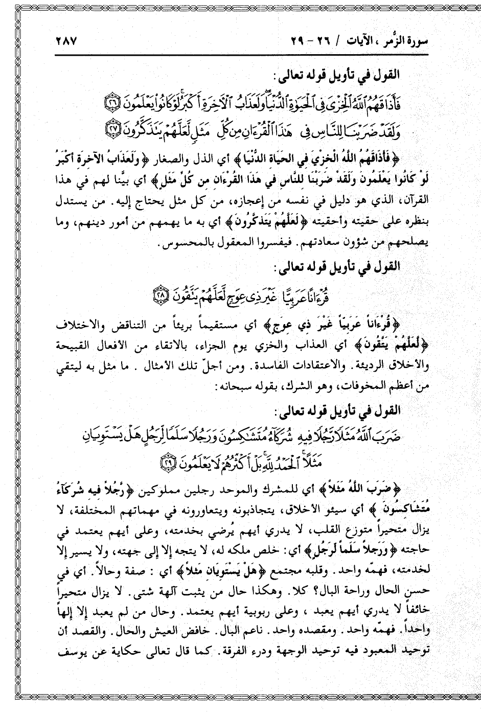 ضَرَبَ اللَّهُ مَثَلاً رَجُلاً فِيهِ شُرَكاءُ مُتَشاكِسُونَ وَرَجُلاً سَلَماً لِرَجُلٍ هَلْ يَسْتَوِيانِ مَثَلاً الْحَمْدُ لِلَّهِ بَلْ أَكْثَرُهُمْ لا يَعْلَمُونَ (29)