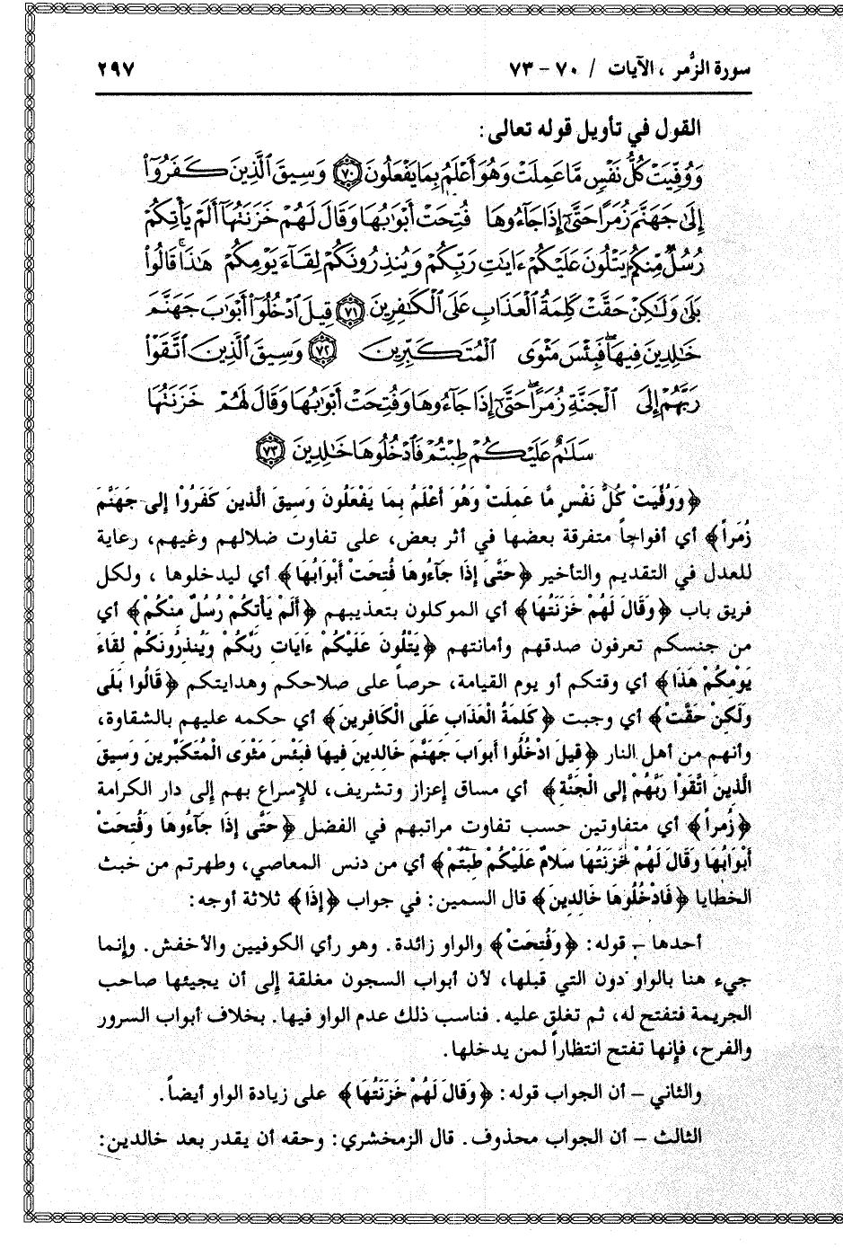 وَوُفِّيَتْ كُلُّ نَفْسٍ ما عَمِلَتْ وَهُوَ أَعْلَمُ بِما يَفْعَلُونَ وَسِيقَ الَّذِينَ كَفَرُوا إِلى جَهَنَّمَ زُمَراً أي أفواجا متفرقة بعضها في أثر بعض، على تفاوت ضلالهم وغيهم، رعاية للعدل في التقديم والتأخير حَتَّى إِذا جاؤُها فُتِحَتْ أَبْوابُها أي ليدخلوها، ولكل فريق باب وَقالَ لَهُمْ خَزَنَتُها أي الموكلون بتعذيبهم أَلَمْ يَأْتِكُمْ رُسُلٌ مِنْكُمْ أي من جنسكم تعرفون صدقهم وأمانتهم يَتْلُونَ عَلَيْكُمْ آياتِ رَبِّكُمْ وَيُنْذِرُونَكُمْ لِقاءَ يَوْمِكُمْ هذا أي وقتكم أو يوم القيامة، حرصا على صلاحكم وهدايتكم قالُوا بَلى وَلكِنْ حَقَّتْ أي وجبت كَلِمَةُ الْعَذابِ عَلَى الْكافِرِينَ أي حكمه عليهم بالشقاوة، وأنهم من أهل النار قِيلَ ادْخُلُوا أَبْوابَ جَهَنَّمَ خالِدِينَ فِيها فَبِئْسَ مَثْوَى الْمُتَكَبِّرِينَ وَسِيقَ الَّذِينَ اتَّقَوْا رَبَّهُمْ إِلَى الْجَنَّةِ أي مساق إعزاز وتشريف، للإسراع بهم إلى دار الكرامة زُمَراً أي متفاوتين حسب تفاوت مراتبهم في الفضل حَتَّى إِذا جاؤُها وَفُتِحَتْ أَبْوابُها وَقالَ لَهُمْ خَزَنَتُها سَلامٌ عَلَيْكُمْ طِبْتُمْ أي من دنس المعاصي، وطهرتم من خبث الخطايا فَادْخُلُوها خالِدِينَ قال السمين: في جواب إِذا ثلاثة أوجه:
