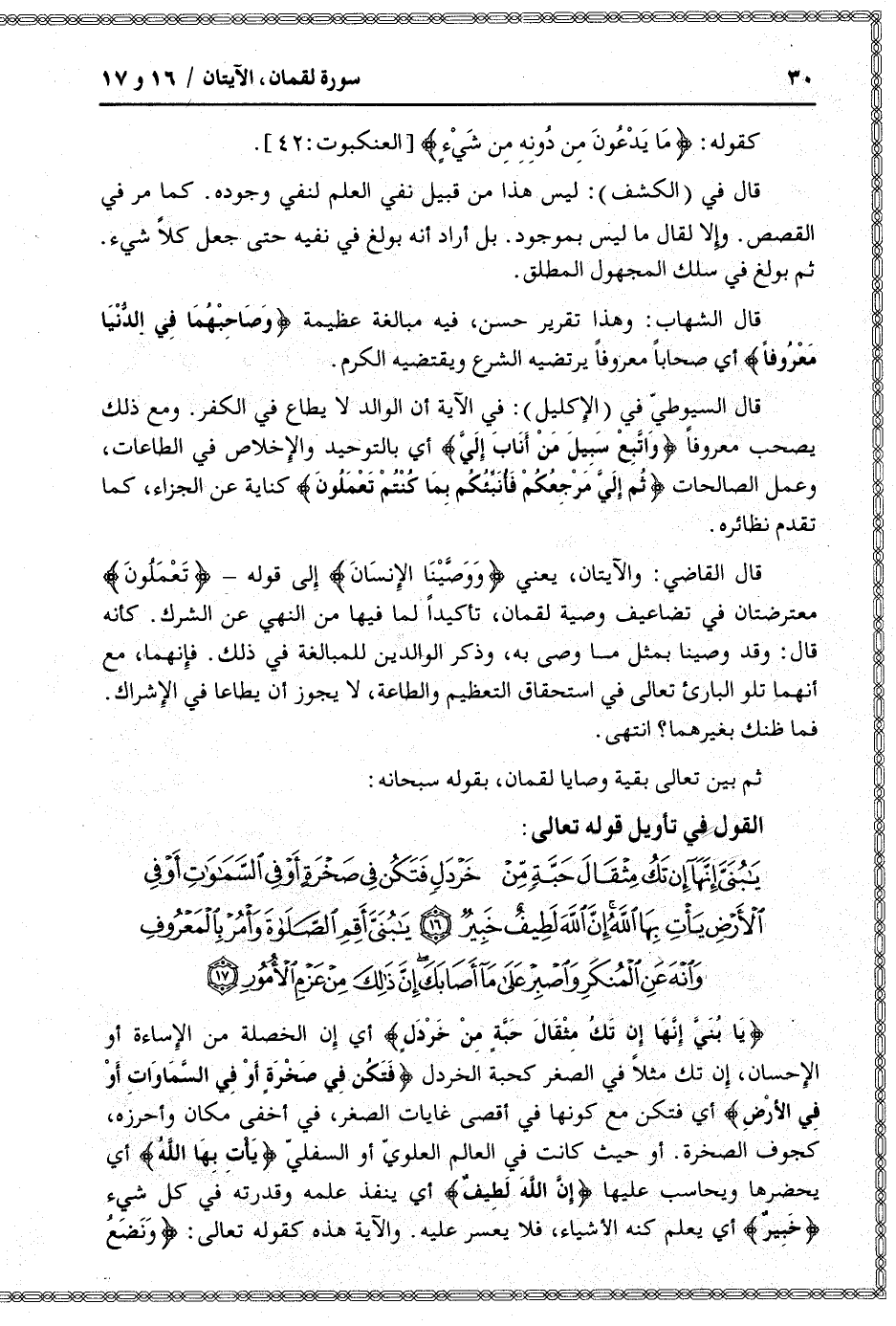 يا بُنَيَّ إِنَّها إِنْ تَكُ مِثْقالَ حَبَّةٍ مِنْ خَرْدَلٍ فَتَكُنْ فِي صَخْرَةٍ أَوْ فِي السَّماواتِ أَوْ فِي الْأَرْضِ يَأْتِ بِهَا اللَّهُ إِنَّ اللَّهَ لَطِيفٌ خَبِيرٌ (16) يا بُنَيَّ أَقِمِ الصَّلاةَ وَأْمُرْ بِالْمَعْرُوفِ وَانْهَ عَنِ الْمُنْكَرِ وَاصْبِرْ عَلى ما أَصابَكَ إِنَّ ذلِكَ مِنْ عَزْمِ الْأُمُورِ (17)