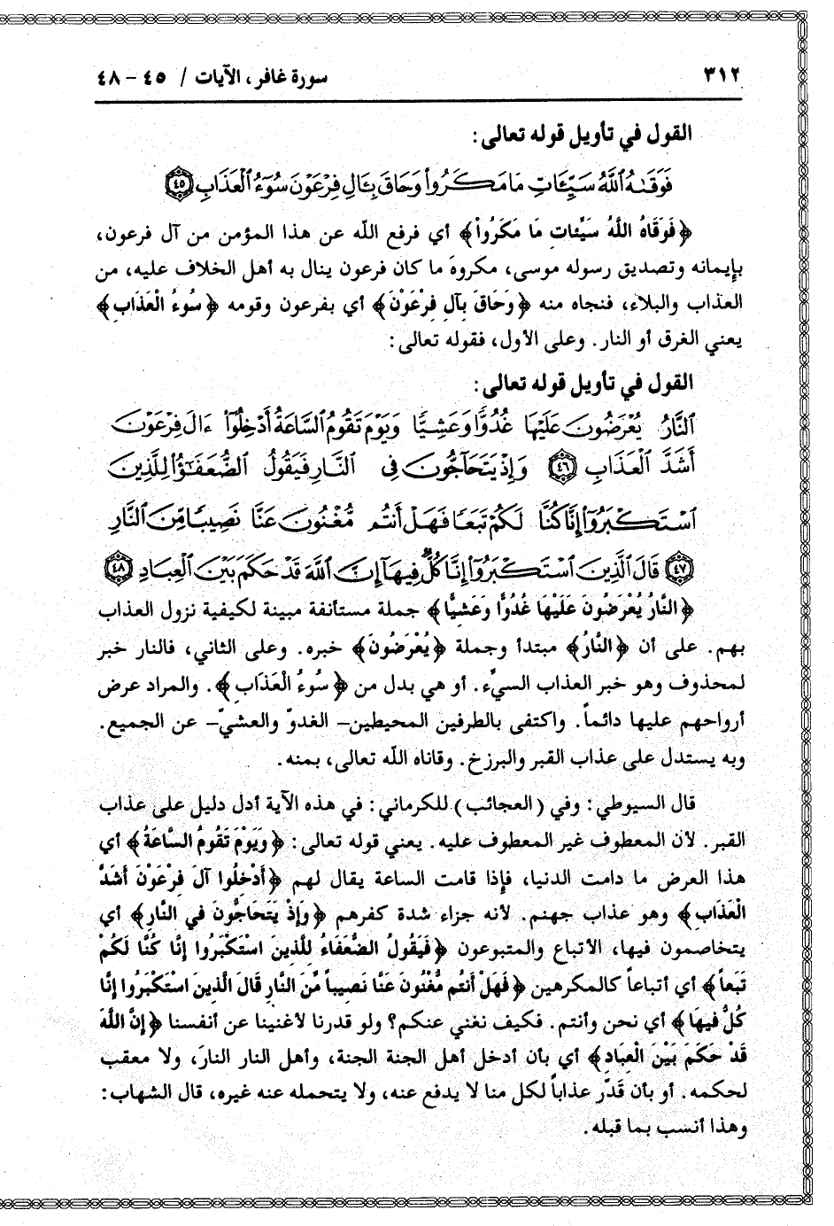 النَّارُ يُعْرَضُونَ عَلَيْها غُدُوًّا وَعَشِيًّا وَيَوْمَ تَقُومُ السَّاعَةُ أَدْخِلُوا آلَ فِرْعَوْنَ أَشَدَّ الْعَذابِ (46) وَإِذْ يَتَحاجُّونَ فِي النَّارِ فَيَقُولُ الضُّعَفاءُ لِلَّذِينَ اسْتَكْبَرُوا إِنَّا كُنَّا لَكُمْ تَبَعاً فَهَلْ أَنْتُمْ مُغْنُونَ عَنَّا نَصِيباً مِنَ النَّارِ (47) قالَ الَّذِينَ اسْتَكْبَرُوا إِنَّا كُلٌّ فِيها إِنَّ اللَّهَ قَدْ حَكَمَ بَيْنَ الْعِبادِ (48)