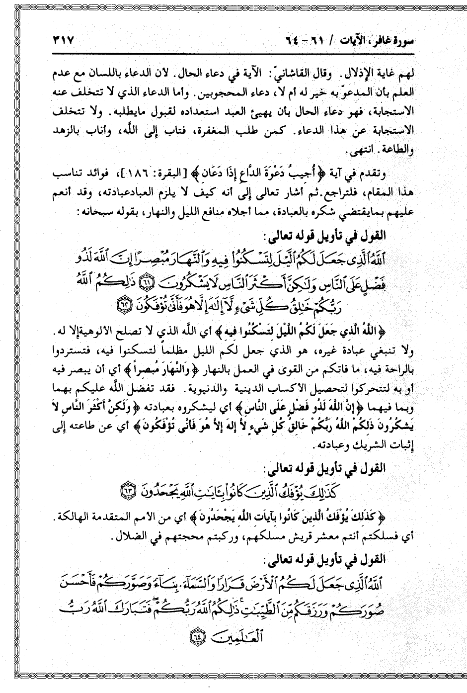 اللَّهُ الَّذِي جَعَلَ لَكُمُ اللَّيْلَ لِتَسْكُنُوا فِيهِ وَالنَّهارَ مُبْصِراً إِنَّ اللَّهَ لَذُو فَضْلٍ عَلَى النَّاسِ وَلكِنَّ أَكْثَرَ النَّاسِ لا يَشْكُرُونَ (61) ذلِكُمُ اللَّهُ رَبُّكُمْ خالِقُ كُلِّ شَيْءٍ لا إِلهَ إِلاَّ هُوَ فَأَنَّى تُؤْفَكُونَ (62)