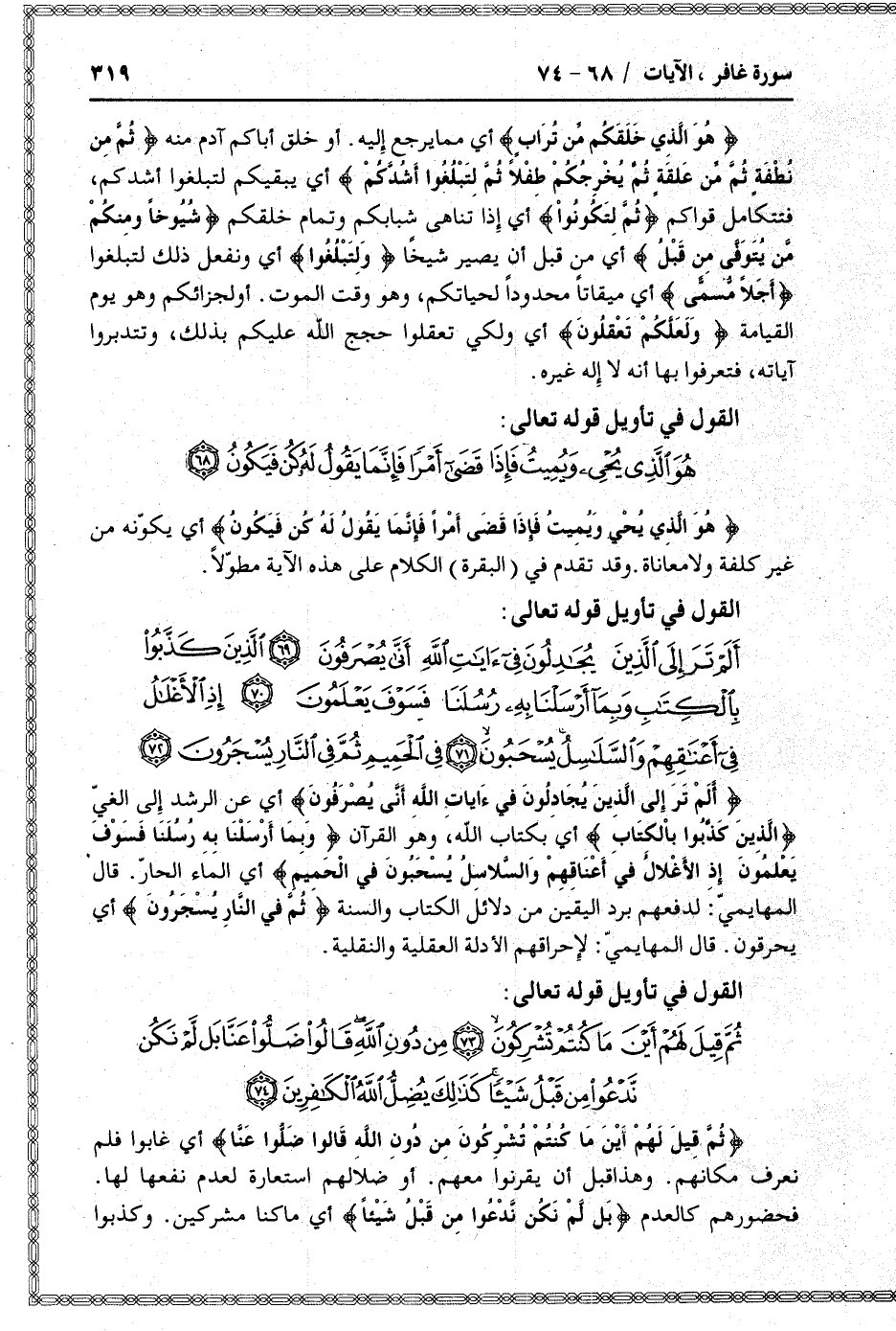 أَلَمْ تَرَ إِلَى الَّذِينَ يُجادِلُونَ فِي آياتِ اللَّهِ أَنَّى يُصْرَفُونَ أي عن الرشد إلى الغيّ الَّذِينَ كَذَّبُوا بِالْكِتابِ أي بكتاب الله، وهو القرآن وَبِما أَرْسَلْنا بِهِ رُسُلَنا فَسَوْفَ يَعْلَمُونَ إِذِ الْأَغْلالُ فِي أَعْناقِهِمْ وَالسَّلاسِلُ يُسْحَبُونَ فِي الْحَمِيمِ أي الماء الحارّ. قال المهايميّ: لدفعهم برد اليقين من دلائل الكتاب والسنة ثُمَّ فِي النَّارِ يُسْجَرُونَ أي يحرقون. قال المهايميّ: لإحراقهم الأدلة العقلية والنقلية.