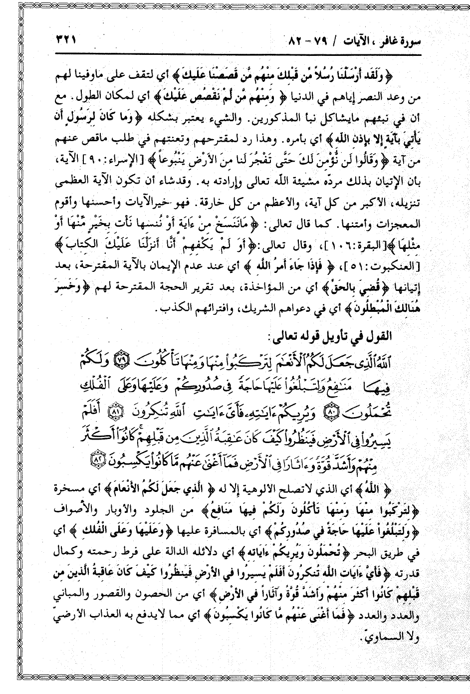 اللَّهُ الَّذِي جَعَلَ لَكُمُ الْأَنْعامَ لِتَرْكَبُوا مِنْها وَمِنْها تَأْكُلُونَ (79) وَلَكُمْ فِيها مَنافِعُ وَلِتَبْلُغُوا عَلَيْها حاجَةً فِي صُدُورِكُمْ وَعَلَيْها وَعَلَى الْفُلْكِ تُحْمَلُونَ (80) وَيُرِيكُمْ آياتِهِ فَأَيَّ آياتِ اللَّهِ تُنْكِرُونَ (81) أَفَلَمْ يَسِيرُوا فِي الْأَرْضِ فَيَنْظُرُوا كَيْفَ كانَ عاقِبَةُ الَّذِينَ مِنْ قَبْلِهِمْ كانُوا أَكْثَرَ مِنْهُمْ وَأَشَدَّ قُوَّةً وَآثاراً فِي الْأَرْضِ فَما أَغْنى عَنْهُمْ ما كانُوا يَكْسِبُونَ (82)