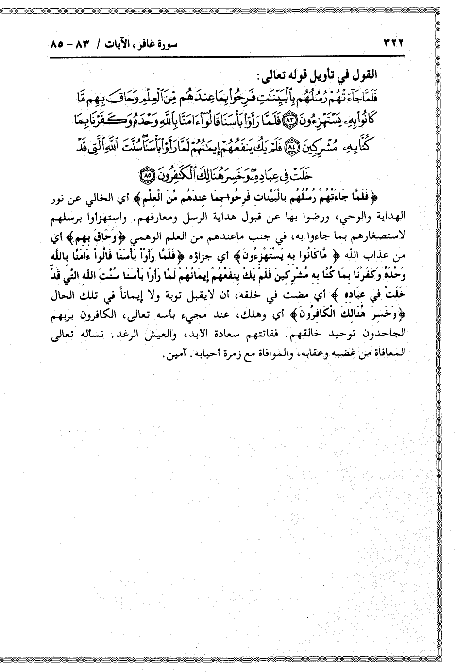 فَلَمَّا جاءَتْهُمْ رُسُلُهُمْ بِالْبَيِّناتِ فَرِحُوا بِما عِنْدَهُمْ مِنَ الْعِلْمِ وَحاقَ بِهِمْ ما كانُوا بِهِ يَسْتَهْزِؤُنَ (83) فَلَمَّا رَأَوْا بَأْسَنا قالُوا آمَنَّا بِاللَّهِ وَحْدَهُ وَكَفَرْنا بِما كُنَّا بِهِ مُشْرِكِينَ (84) فَلَمْ يَكُ يَنْفَعُهُمْ إِيمانُهُمْ لَمَّا رَأَوْا بَأْسَنا سُنَّتَ اللَّهِ الَّتِي قَدْ خَلَتْ فِي عِبادِهِ وَخَسِرَ هُنالِكَ الْكافِرُونَ (85)