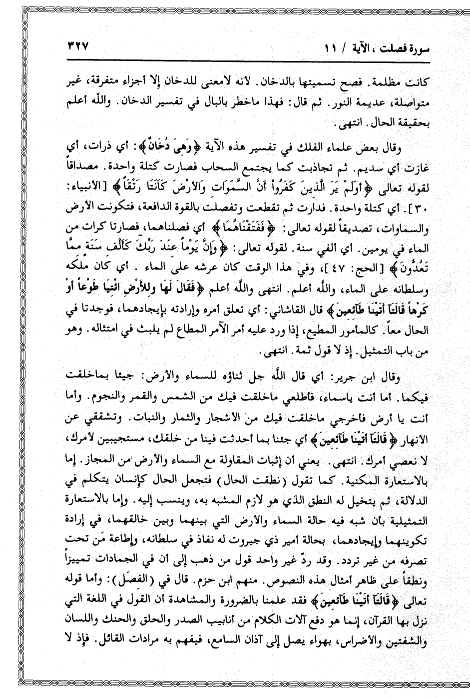 وقال ابن جرير: أي قال الله جل ثناؤه للسماء والأرض: جيئا بما خلقت فيكما. أما أنت يا سماء، فأطلعي ما خلقت فيك من الشمس والقمر والنجوم. وأما أنت يا أرض فأخرجي ما خلقت فيك من الأشجار والثمار والنبات. وتشققي عن الأنهار قالَتا أَتَيْنا طائِعِينَ أي جئنا بما أحدثت فينا من خلقك، مستجيبين لأمرك، لا نعصي أمرك. انتهى. يعني أن إثبات المقاولة مع السماء والأرض من المجاز. إما بالاستعارة المكنية. كما تقول (نطقت الحال) فتجعل الحال كإنسان يتكلم في الدلالة، ثم يتخيل له النطق الذي هو لازم المشبه به، وينسب إليه. وإما بالاستعارة التمثيلية بأن شبه فيه حالة السماء والأرض التي بينهما وبين خالقهما، في إرادة تكوينهما وإيجادهما، بحالة أمير ذي جبروت له نفاذ في سلطانه، وإطاعة من تحت تصرفه من غير تردد. وقد ردّ غير واحد قول من ذهب إلى أن في الجمادات تمييزا ونطقا على ظاهر أمثال هذه النصوص. منهم ابن حزم. قال في (الفصل) : وأما قوله تعالى قالَتا أَتَيْنا طائِعِينَ فقد علمنا بالضرورة والمشاهدة أن القول في اللغة التي نزل بها القرآن، إنما هو دفع آلات الكلام من أنابيب الصدر والحلق والحنك واللسان والشفتين والأضراس، بهواء يصل إلى آذان السامع، فيفهم به مرادات القائل. فإذ لا