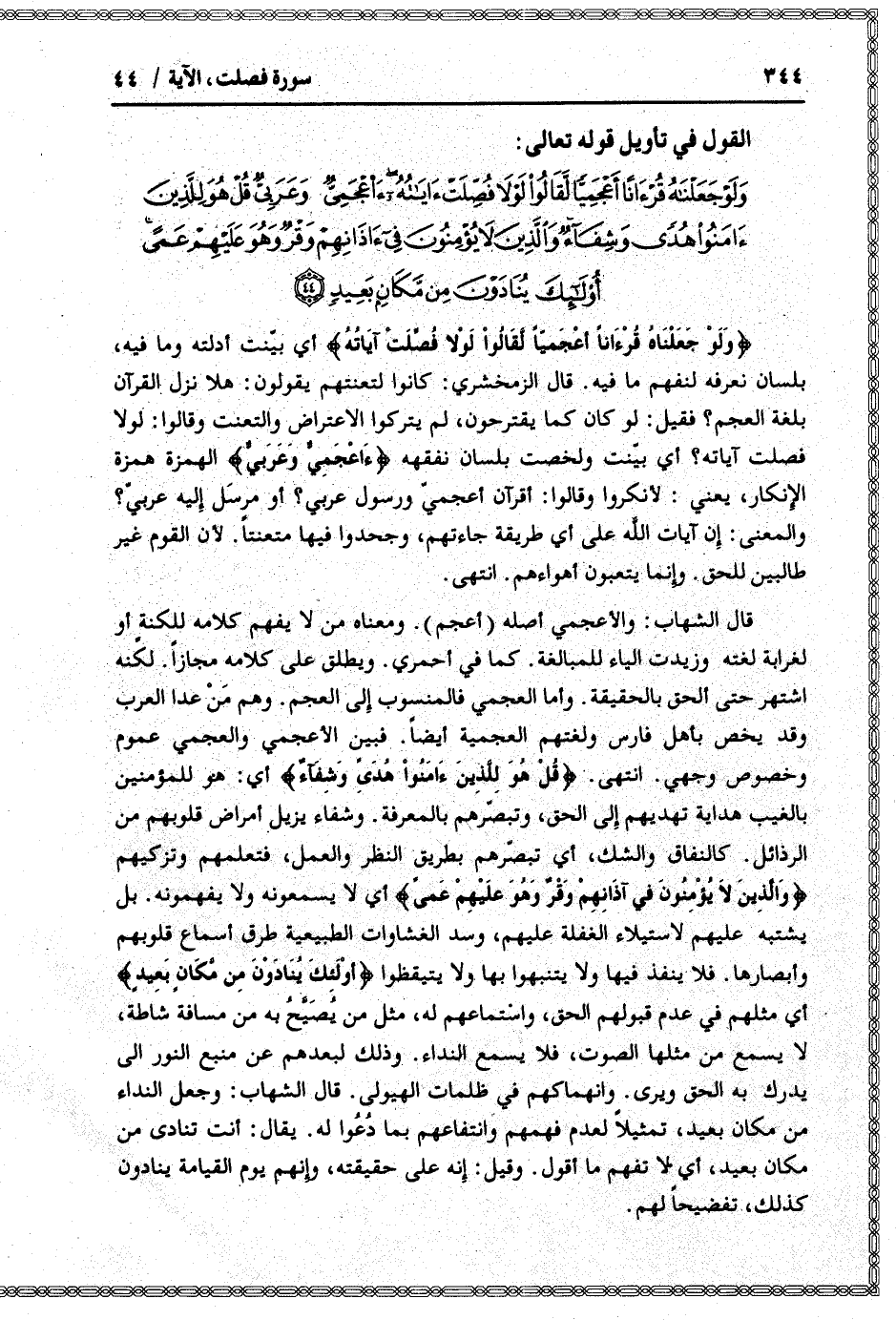 وَلَوْ جَعَلْناهُ قُرْآناً أَعْجَمِيًّا لَقالُوا لَوْلا فُصِّلَتْ آياتُهُءَ أَعْجَمِيٌّ وَعَرَبِيٌّ قُلْ هُوَ لِلَّذِينَ آمَنُوا هُدىً وَشِفاءٌ وَالَّذِينَ لا يُؤْمِنُونَ فِي آذانِهِمْ وَقْرٌ وَهُوَ عَلَيْهِمْ عَمًى أُولئِكَ يُنادَوْنَ مِنْ مَكانٍ بَعِيدٍ (44)